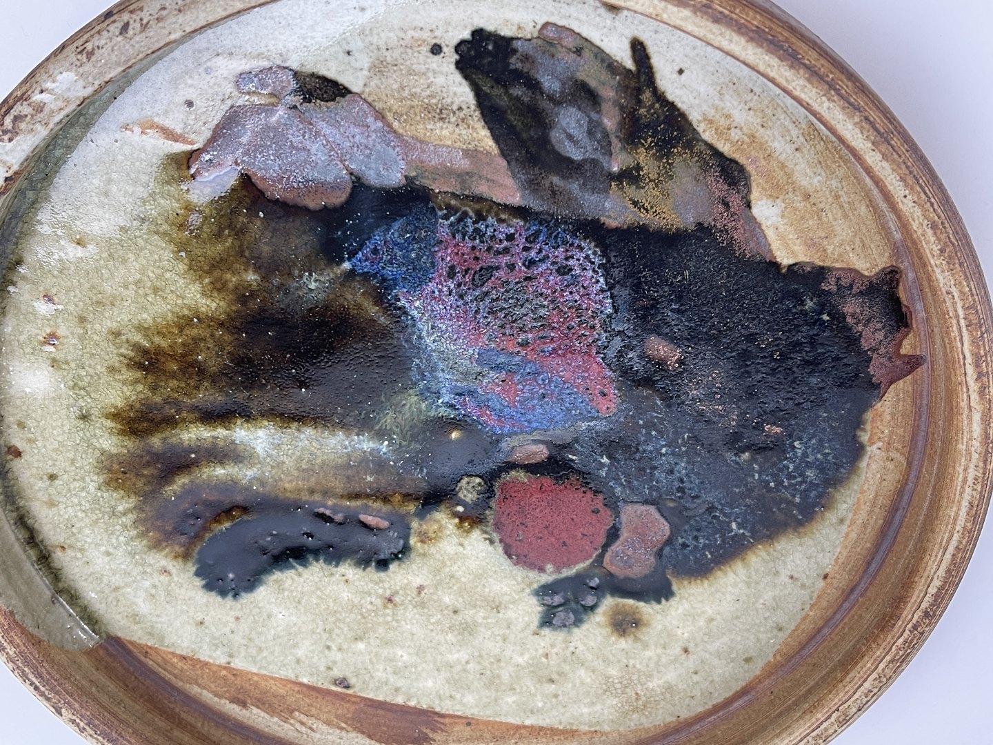 Conni Walther, own workshop. Large dish with multicolored glaze. 20th Century.