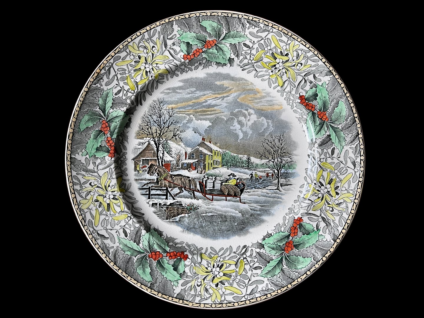 Adams England Winter Scenes Middagstallerken, diameter 26,50 centimeter / 10 3/8". Dekoreret i farver på baggrund af graveringer af N. Currier, New York. Randen på tallerkenerne er dekoreret med kristtorn og mistelten, hvormed tallerkenener udover vinterscener også emmer lidt af jul. 20. århundrede.