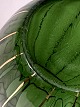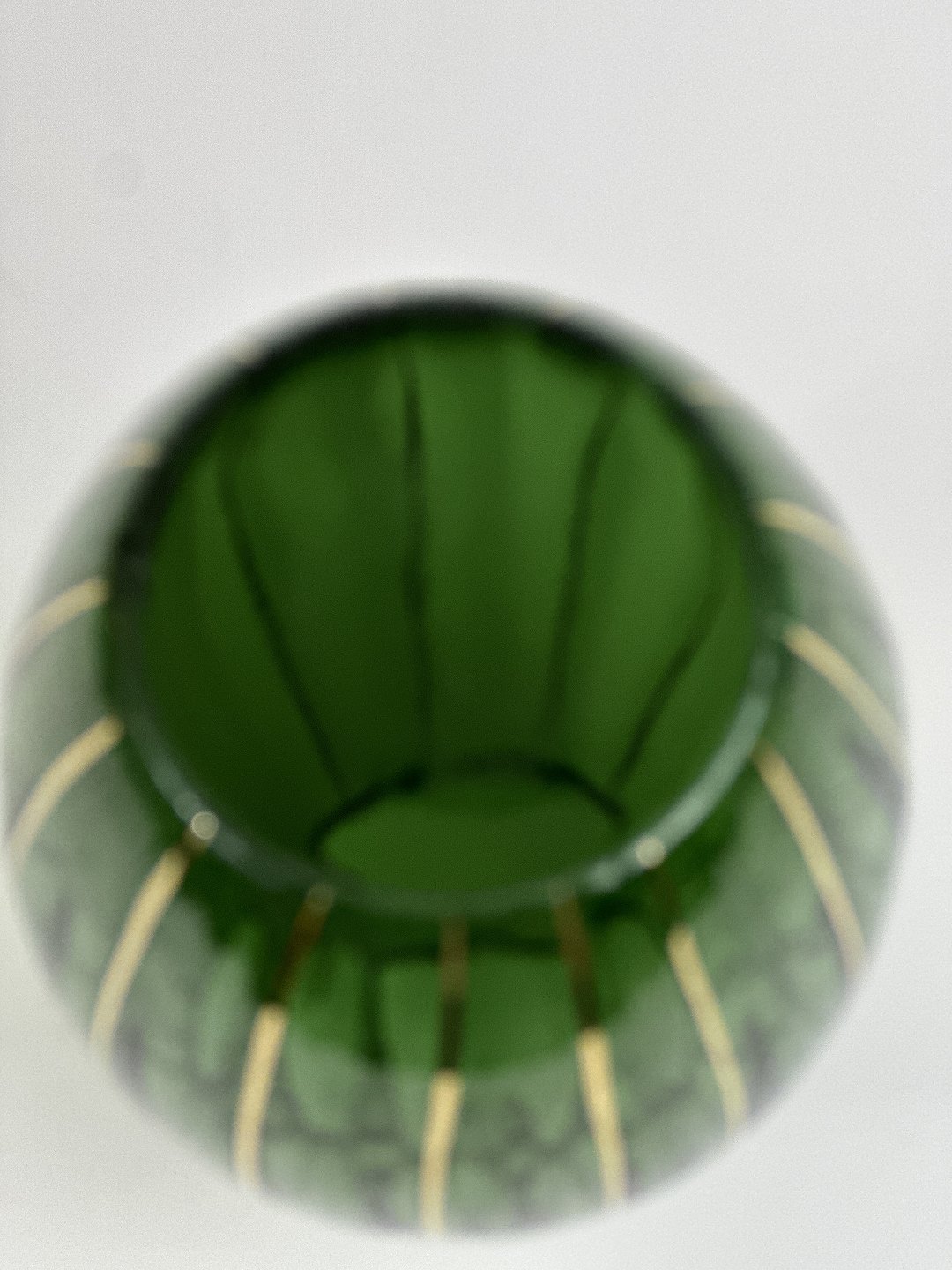Sjælden vase fra Holmegaard, 1950'erne. Vasen har optiske striber og forgyldning langs nogle af striberne og ved kanten. Vasen er usigneret og tilskrives enten Per Lutken eller Jacob E. Bang.