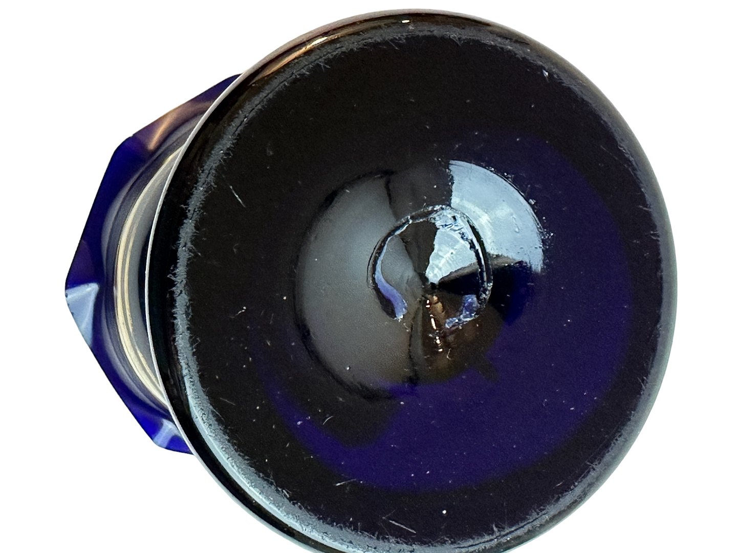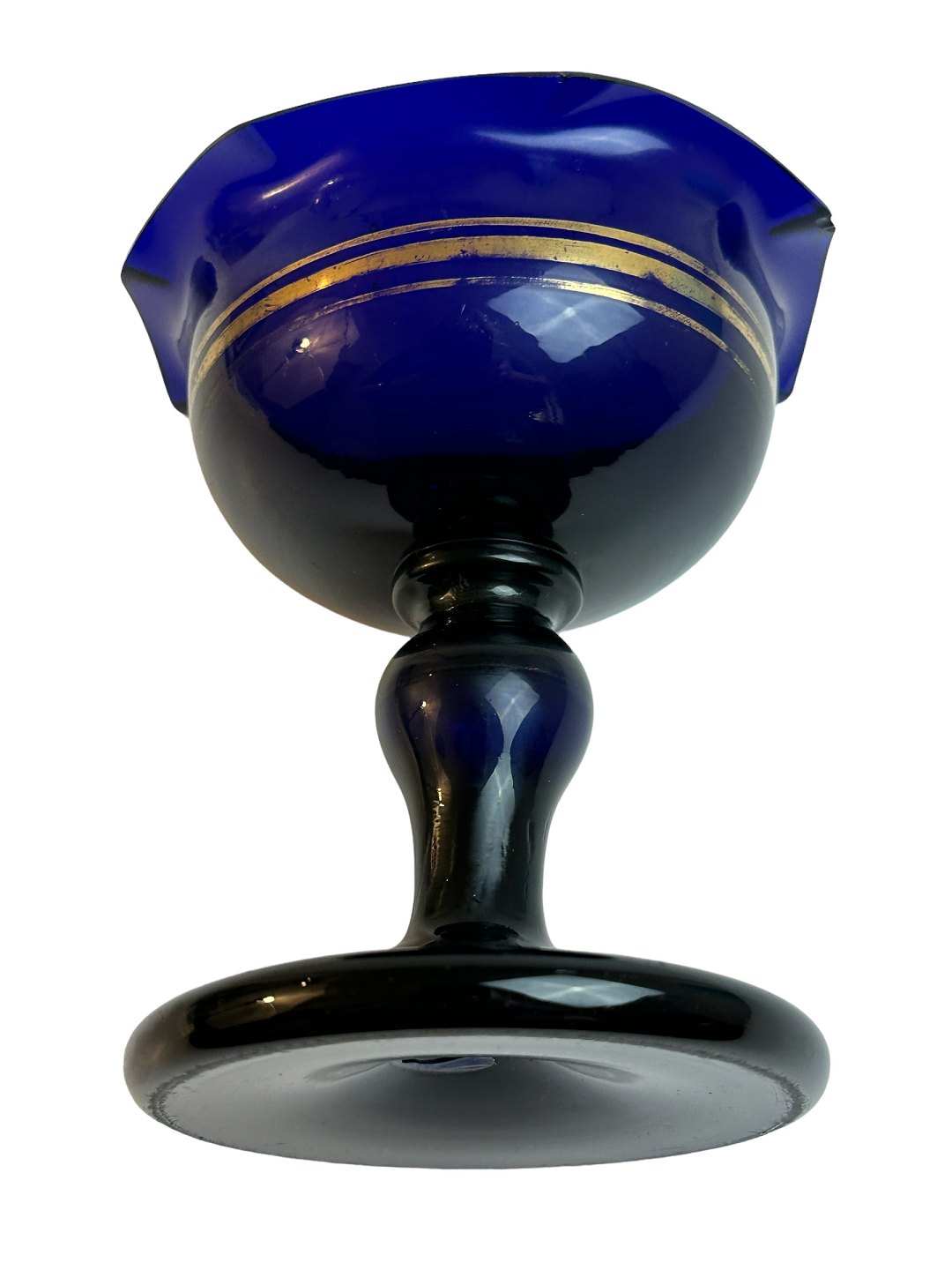 Kandisskål, sukkerskål, sukkerfad. Blåt glas med guldstribe. Bølget kant.
