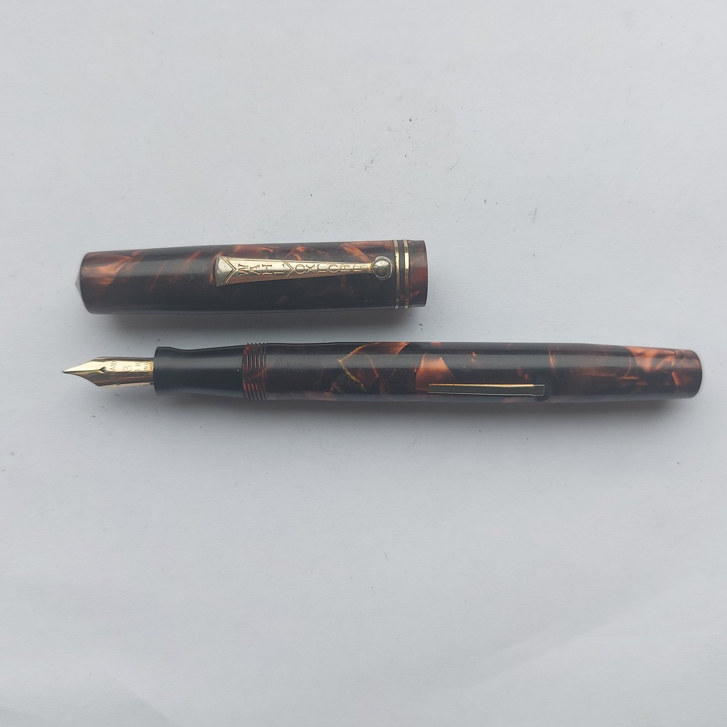 Eversharp product: Marbled Wahl Oxford fountain pen with liver filler. Appears in good condition. Text on the body: Made in U.S.A by the maker of EVERSHARP. No damage or repairs. 14 karat gold nib made in U.S.A. Does not work. A new rubber set must be inserted before the fountain pen writes again.