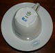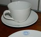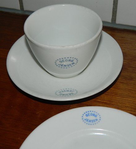 White glazed coffee cup and saucer and cake plate in iron porcelain from Royal Copenhagen. Georg Jensen silver stamp on all three. All parts factory marked from Royal Copenhagen and Georg Jensen logo. Factory first production with no damage or repairs. The cup is 6½ cm high and cake plate is 15 cm in diameter