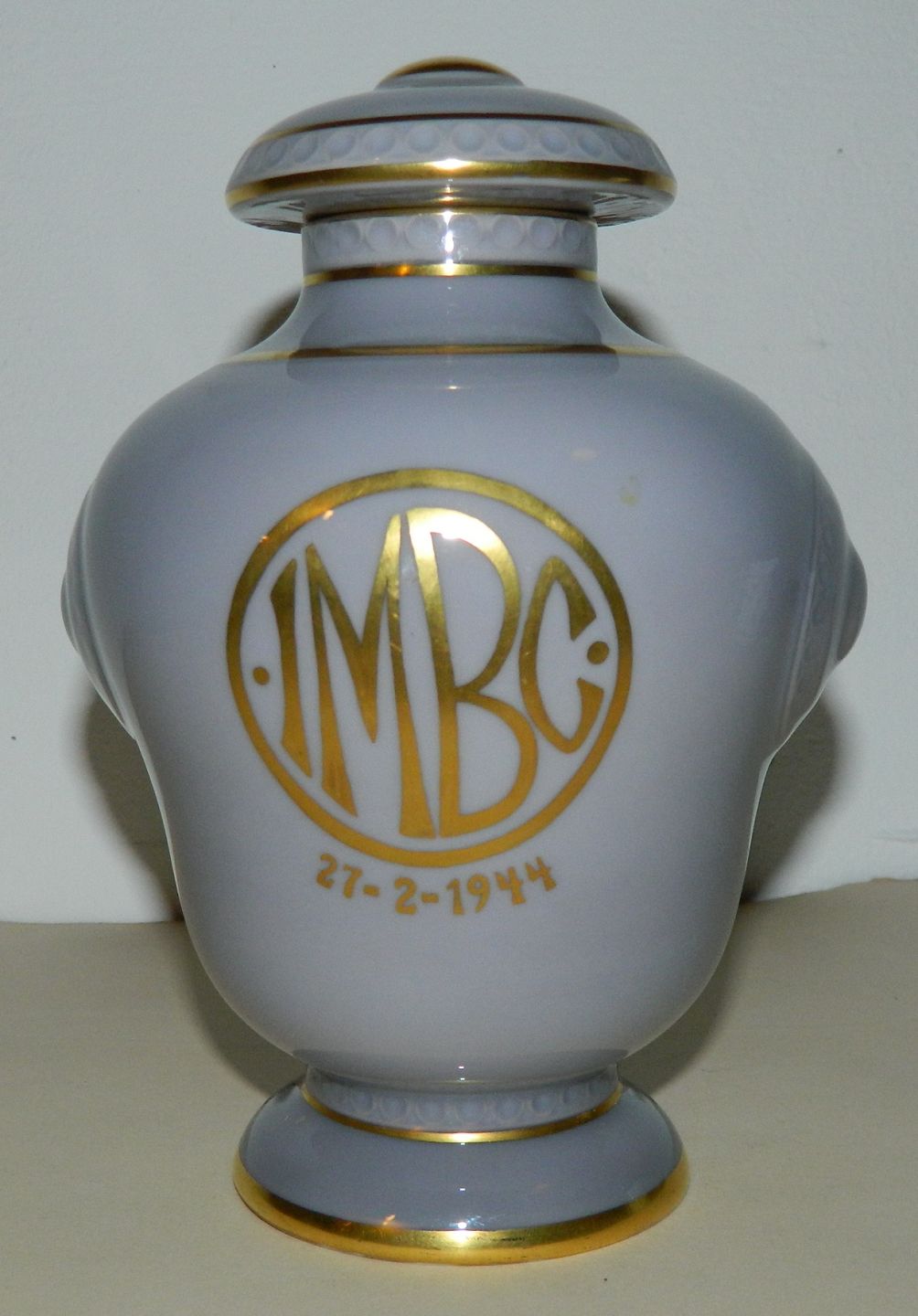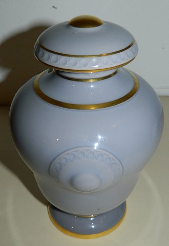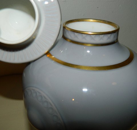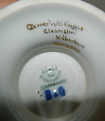 Lidded porcelain jar from Bing & Grondahl. Painted with unknown monogram in 1944. In good condition with no damage or repairs. Factory first production. Decorated byGerner Weidingers Glass Painting Company in Copenhagen ! 17 cm high inclusive lid.
