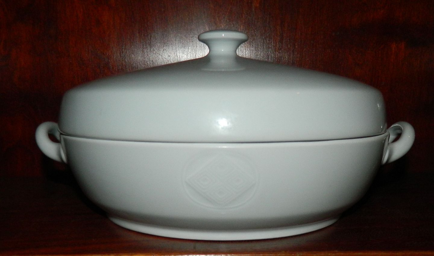 Terrin med låg i porcelæn fra stellet "Gemma" fra Royal Copenhagen. Fremstår i god stand uden skader eller reparationer. 3. sortering. Fabriksmærket på bunden af hankeskålen. Låget ligeledes stemplet på undersiden. Mål: 13 cm høj og 27½ cm fra hank til hank.