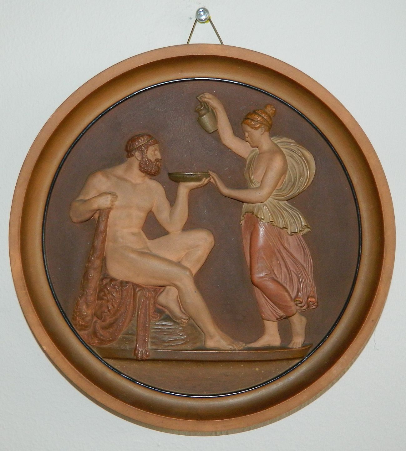 Bemalet platte i terracotta fra Peter Ipsen, Kjøbenhavn. Motiv af Bertel Thorvaldsen (1770-1844) med "Herkules modtager udødelighedens drik af Hebe". Har et par små skår. Fremstillet omkring 1870. Fabriksmærket på bagsiden med P. Ipsen samt modelnummer. Mål: 22½ cm i diameter.