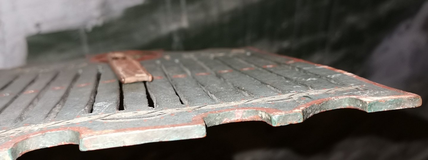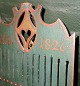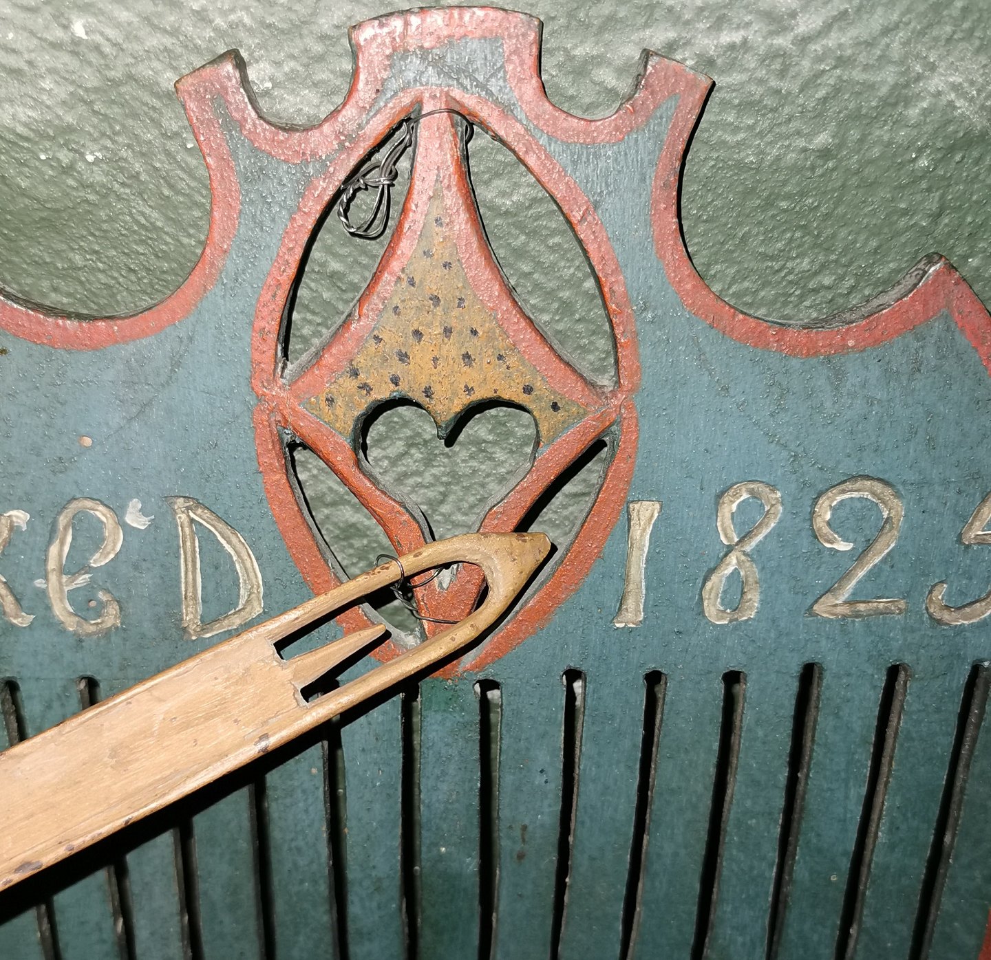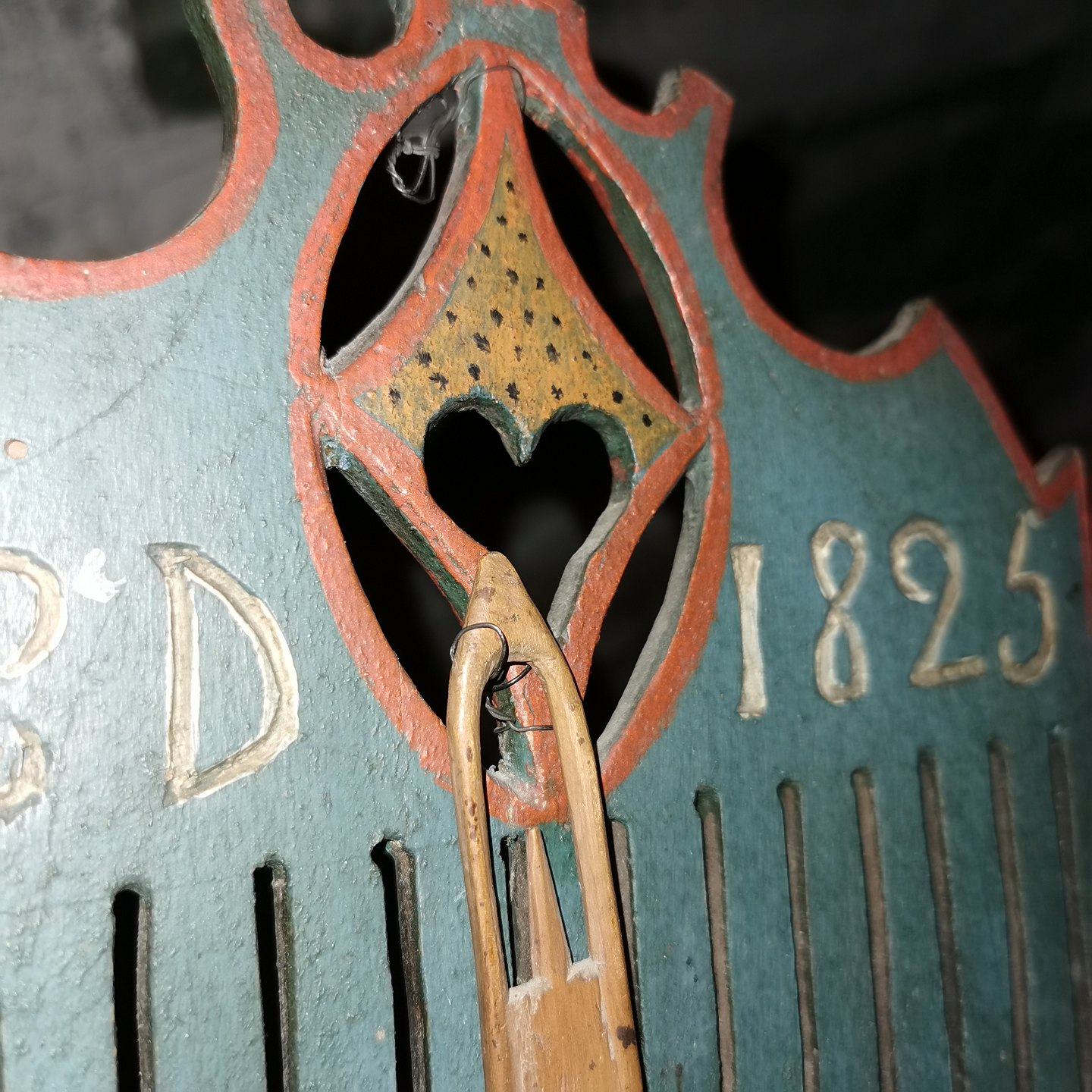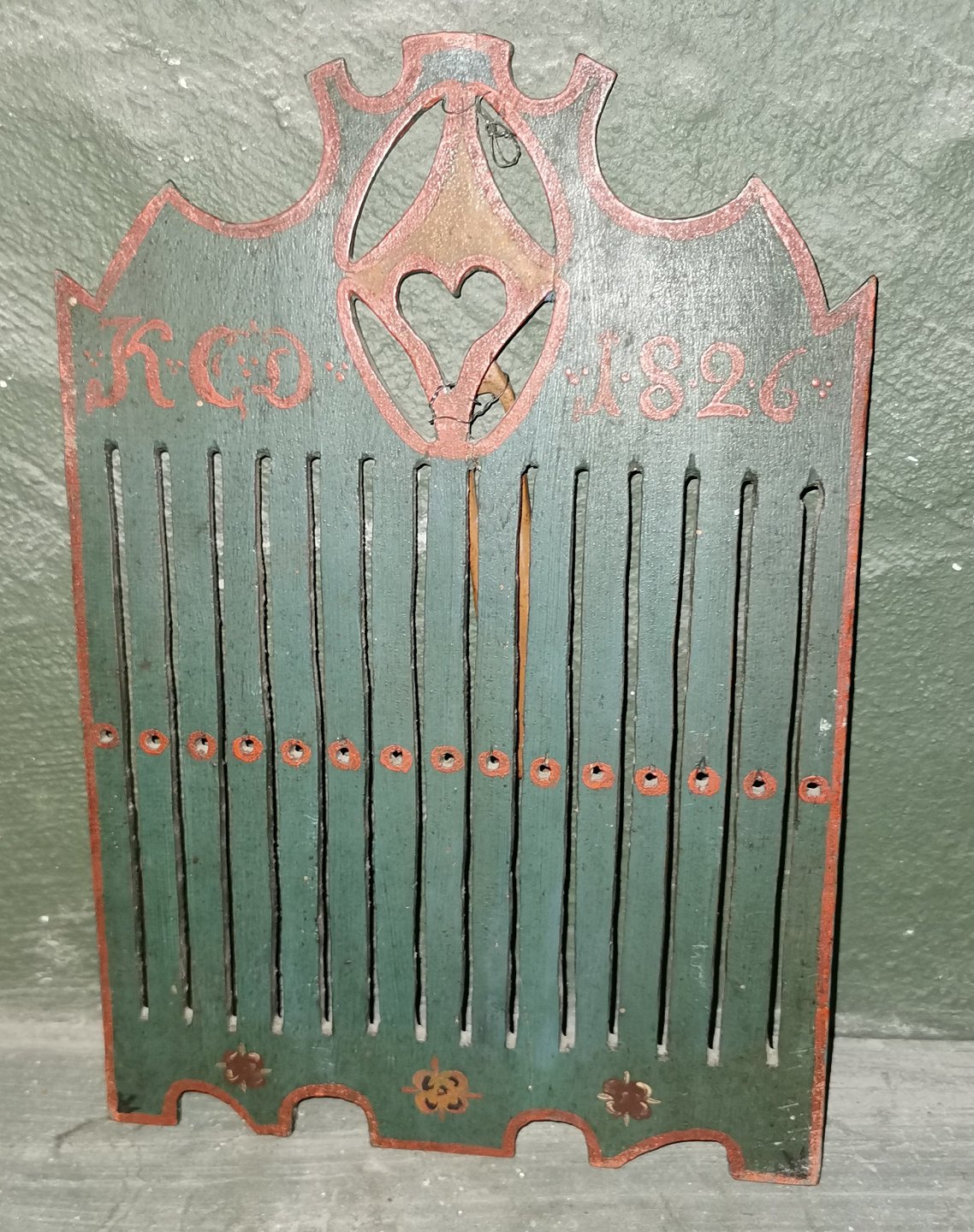 Bemalet vævespjæld med udskæringer og tilhørende bødenål/skyttepind. Dekoreret med bl.a. årstal 1825 og initialer. I god stand. H: 21½ cm. B: 31½ cm
