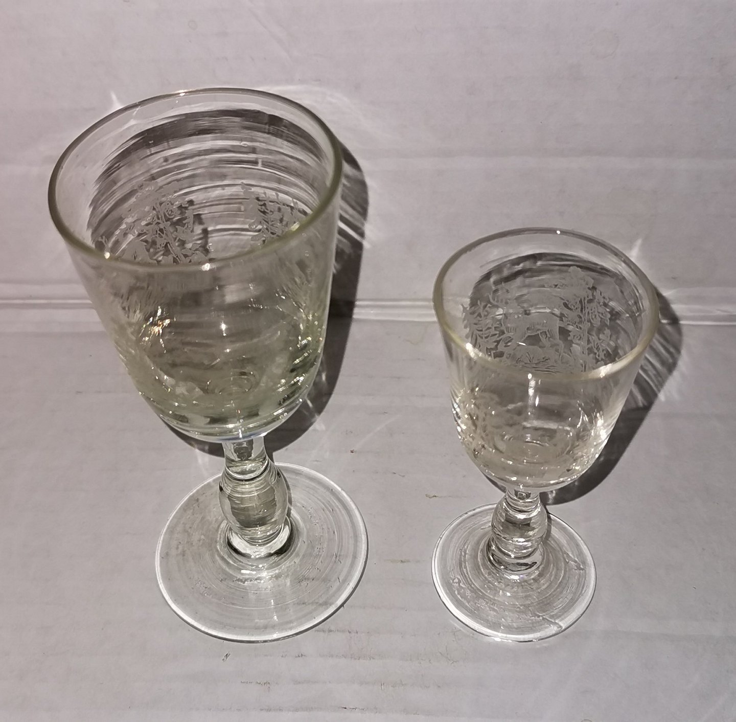Snapseglas -og hedvinsglas. Med hjortmotiv. Begge fra Kastrup Glasværk. Hhv. 10½ og 8 cm høje. I god stand. I ALT HAVE TO HEDVINSGLAS OG 3 SNAPSEGLAS