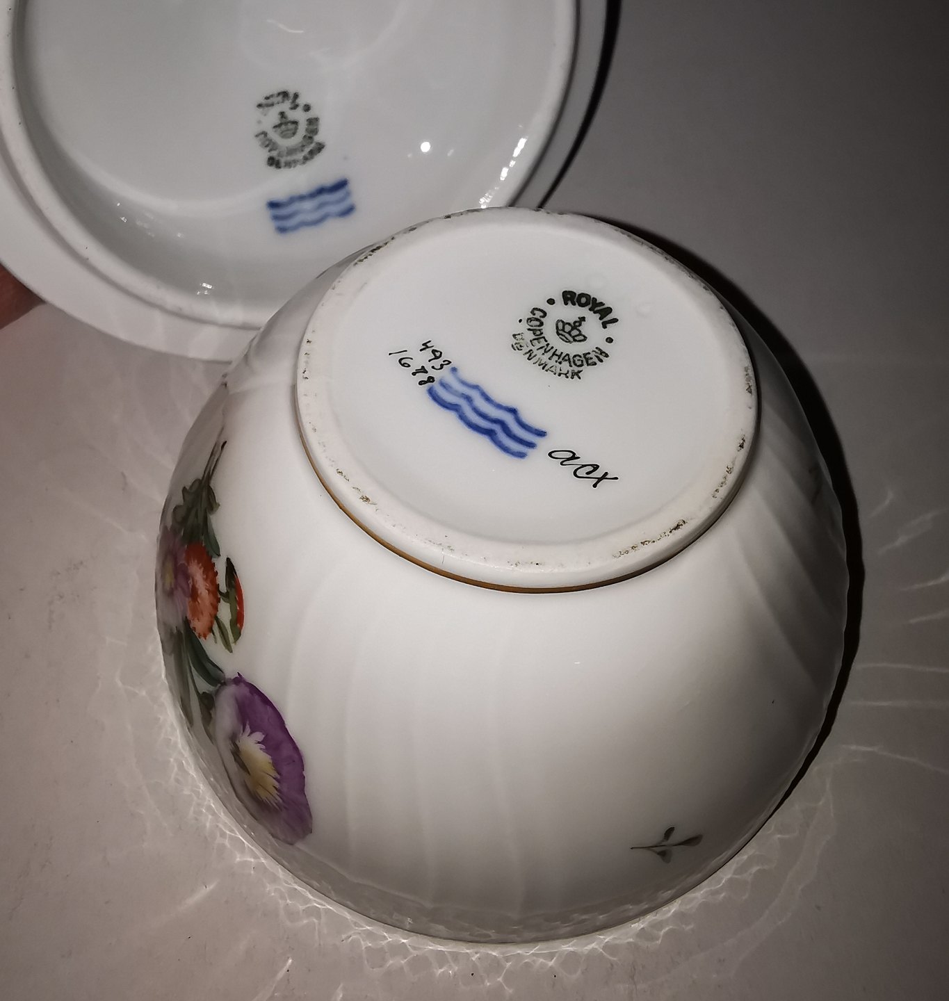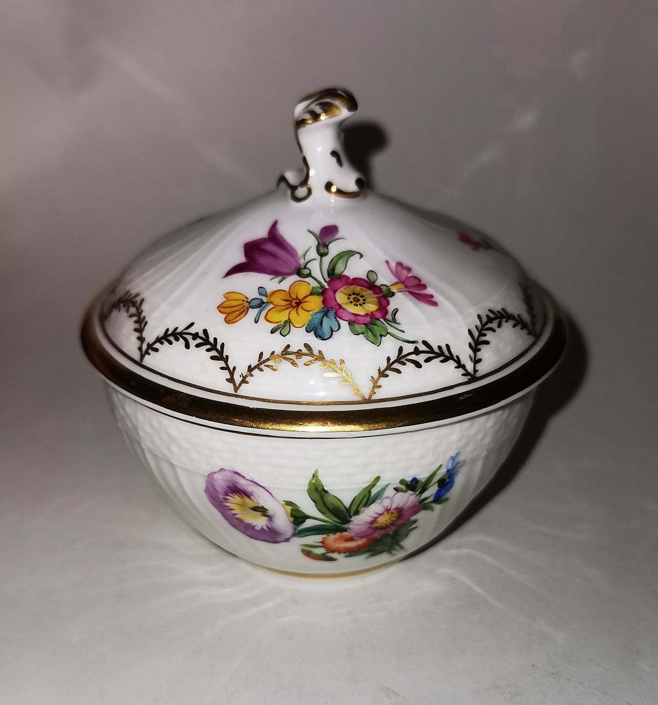 Saxon Flower porcelain sugar bowl with lid from Royal Copenhagen. Model number 493 / 1678. In good condition without damage or repairs. Factory first production H. 10½ cm (4.13 inches).