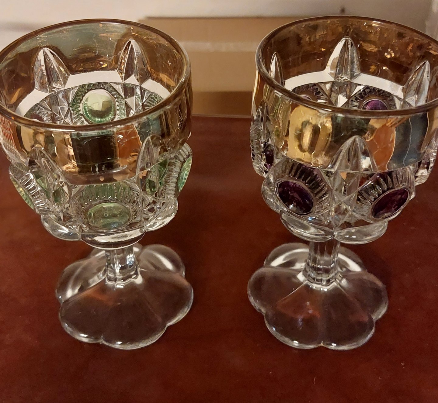 Par presset glas med guldkant. "Amerikanerglas". Fremstillet i begyndelsen af 20. århundrede. Fremstår i god stand. Sælges samlet. H. 15 cm (5.90 inches).