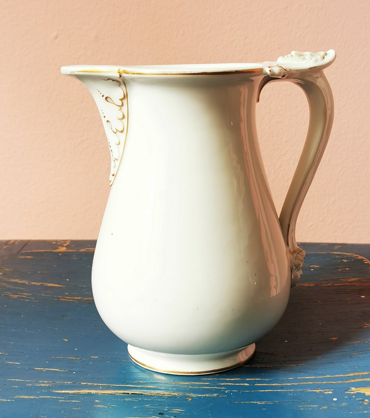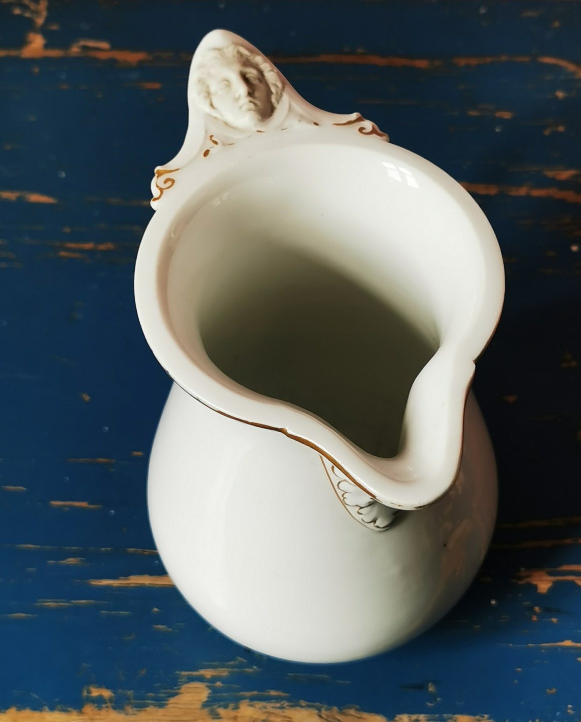 Kande i hvid porcelæn med dekoration af bisquit ansigter fra Royal Copenhagen. Fremstår i god stand uden skader eller reparationer. Fremstillet i slutningen af 19. århundrede. Fabriksmærket på bunden. H. 15 cm (5.90 tommer)