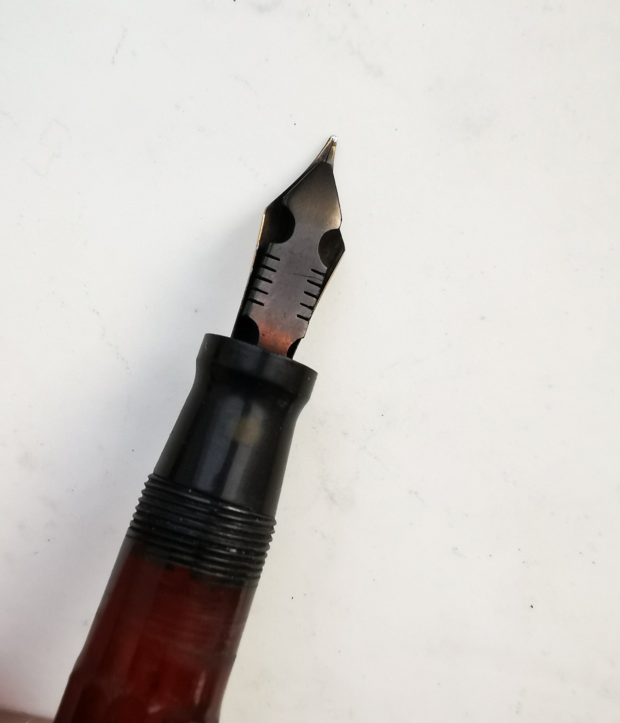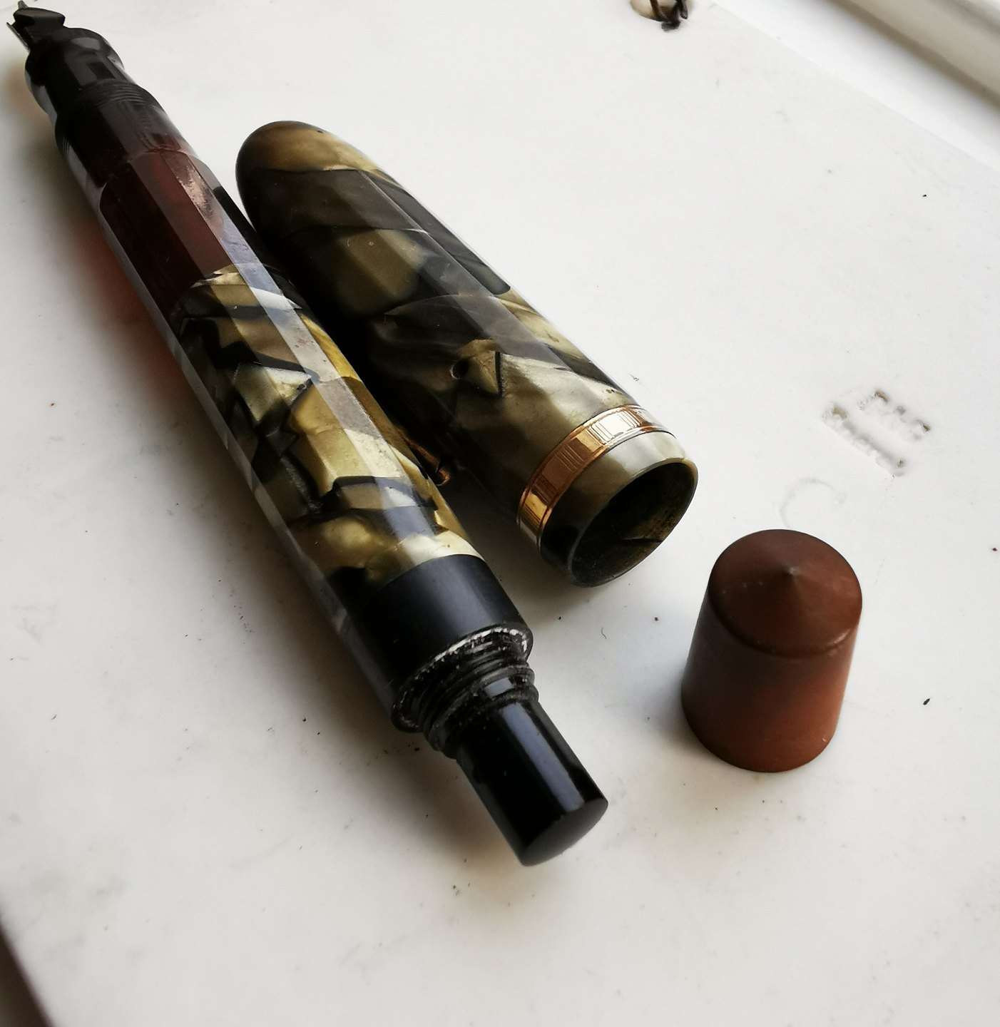 Grønmarmoreret fyldepen fra The Conklin Pen Co. i U.S.A. Både hætten og kroppen er 14-kantet. Usædvanlig lang model af en fyldepen 14½ cm lang (5.70 tommer). Fremstår i meget god stand. Påfyldningsmekanismen fungerer. Kører op og ned inde bag blækvinduet når bundskruen aktiveres ved at blive drejet. Ingen skader eller reparationer. på spidsen står der "Conklin Cushon, POINT 14KT U.S.A.