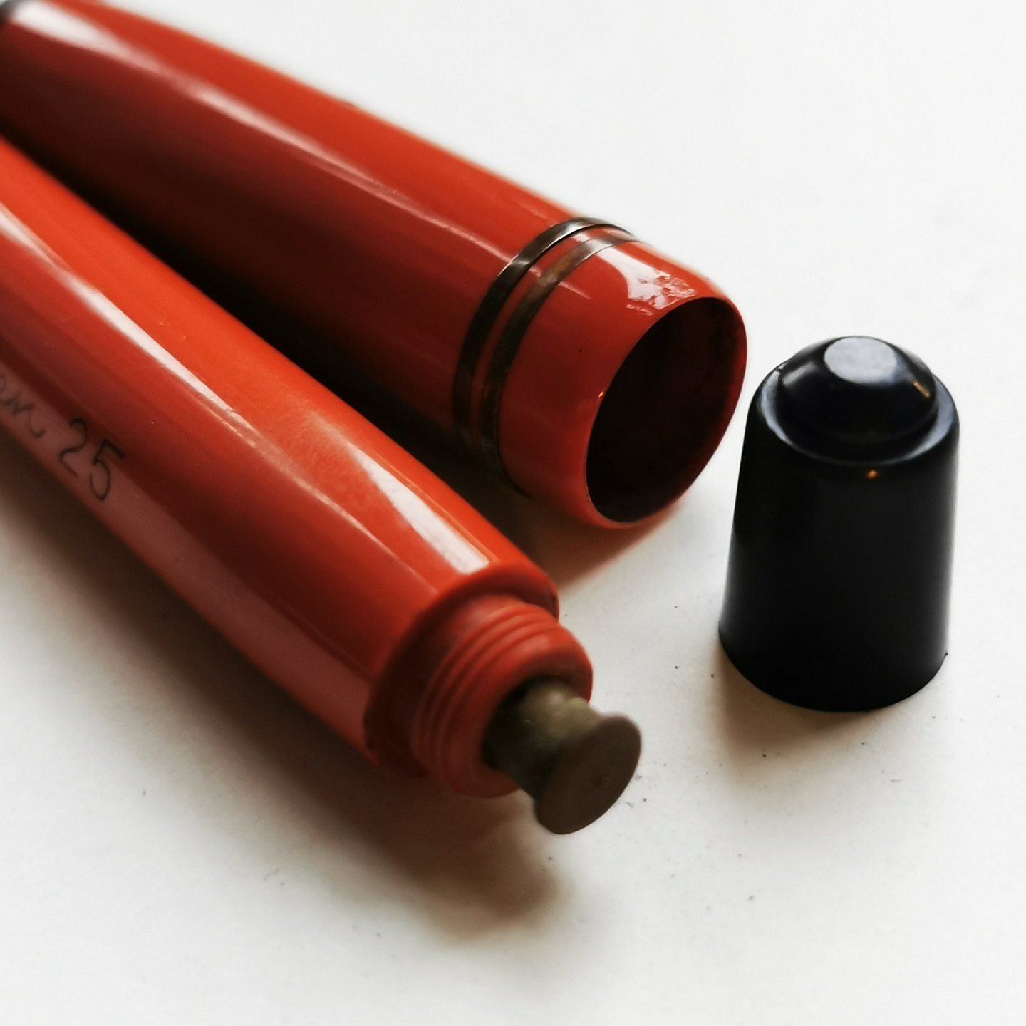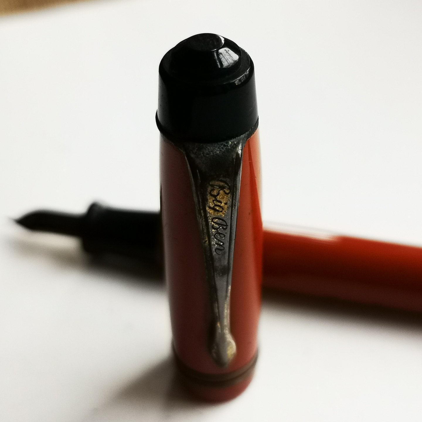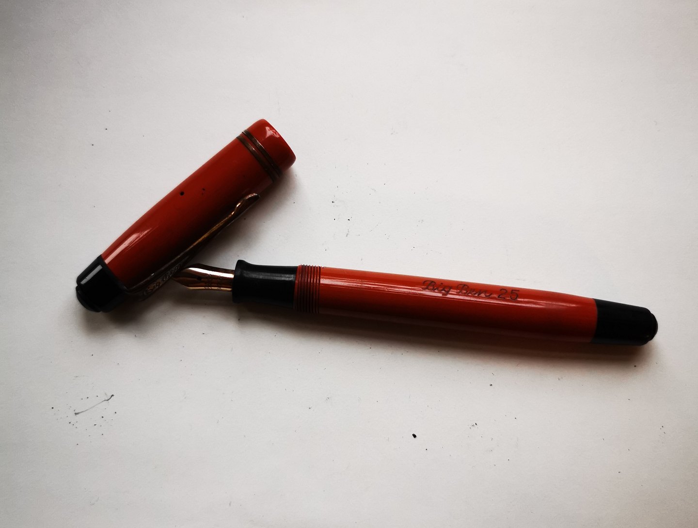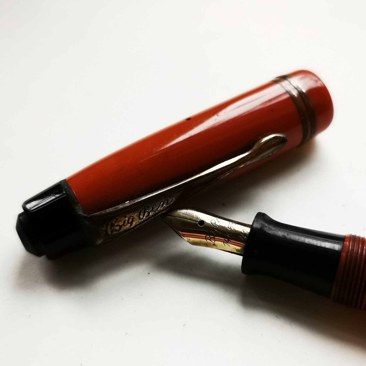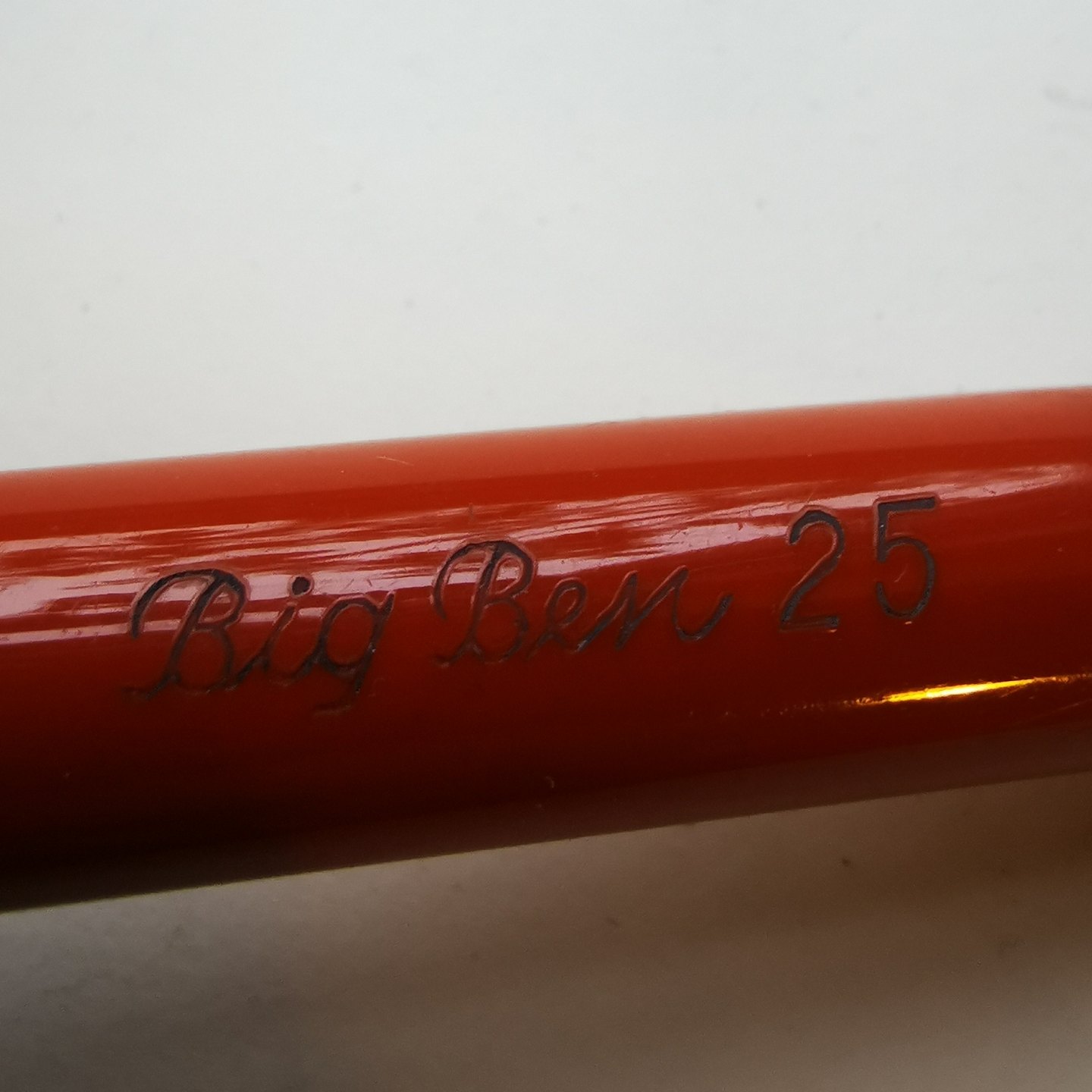 Koralrød Big Ben nr. 25 fyldepen. "Push button filler" Fremstår i god stand uden skader eller reparationer. Alle dele originale Big Ben inclusive en 14 karat guldspids. L. 13 cm (5.11 tommer).