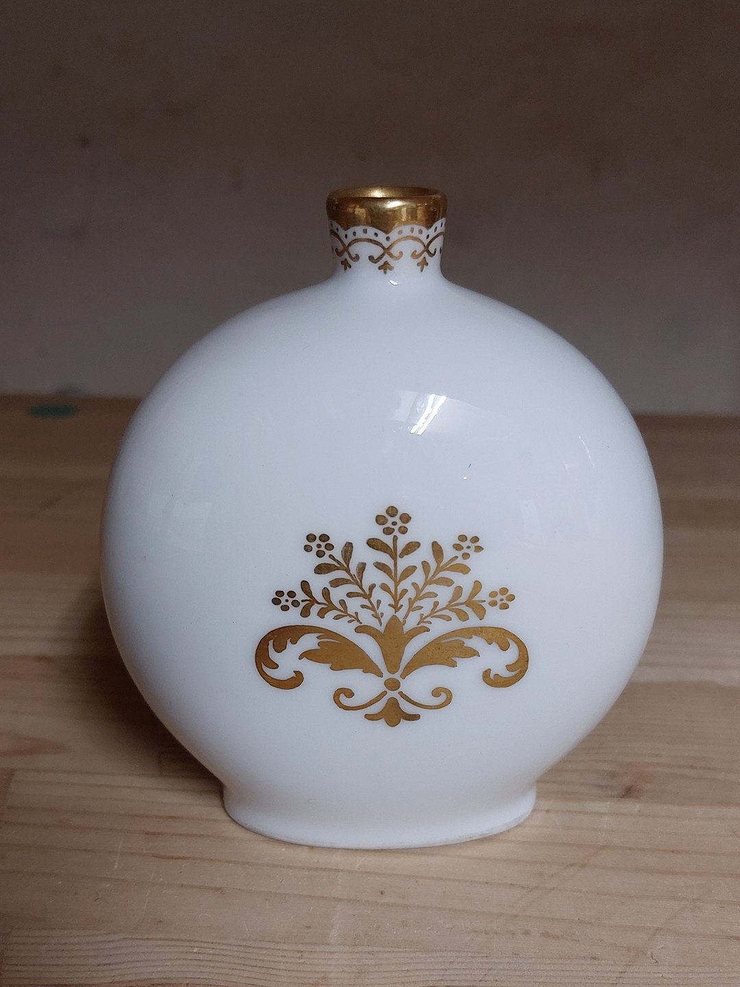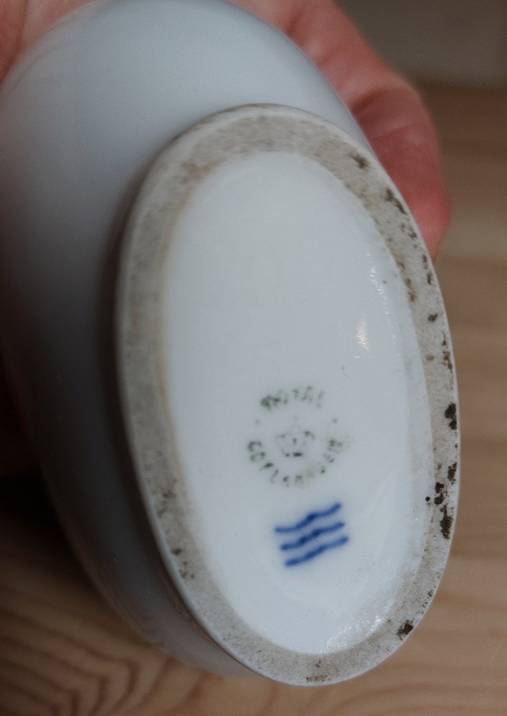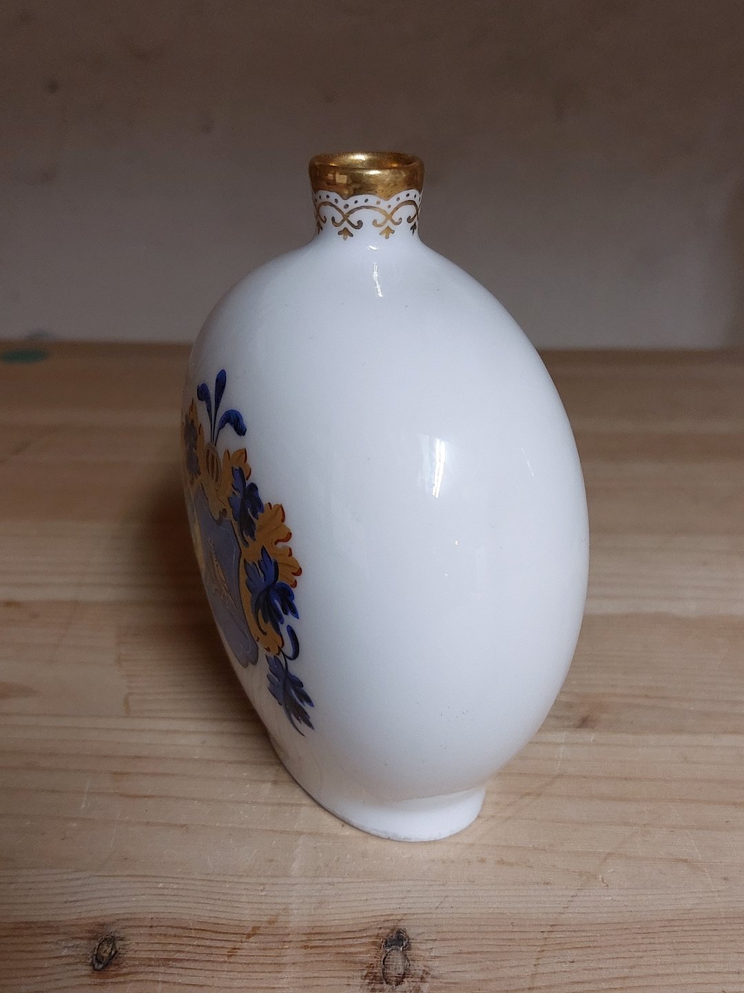 Pill-shaped Royal Copenhagen vase in porcelain with decorated noble coat of arms in overglaze. Also gold decorations. Made between 1900-1923. Appears in perfect condition. 1th. quality. No damage or repairs. Factory mark on the bottom. H. 10.5 cm (4.13 inches).