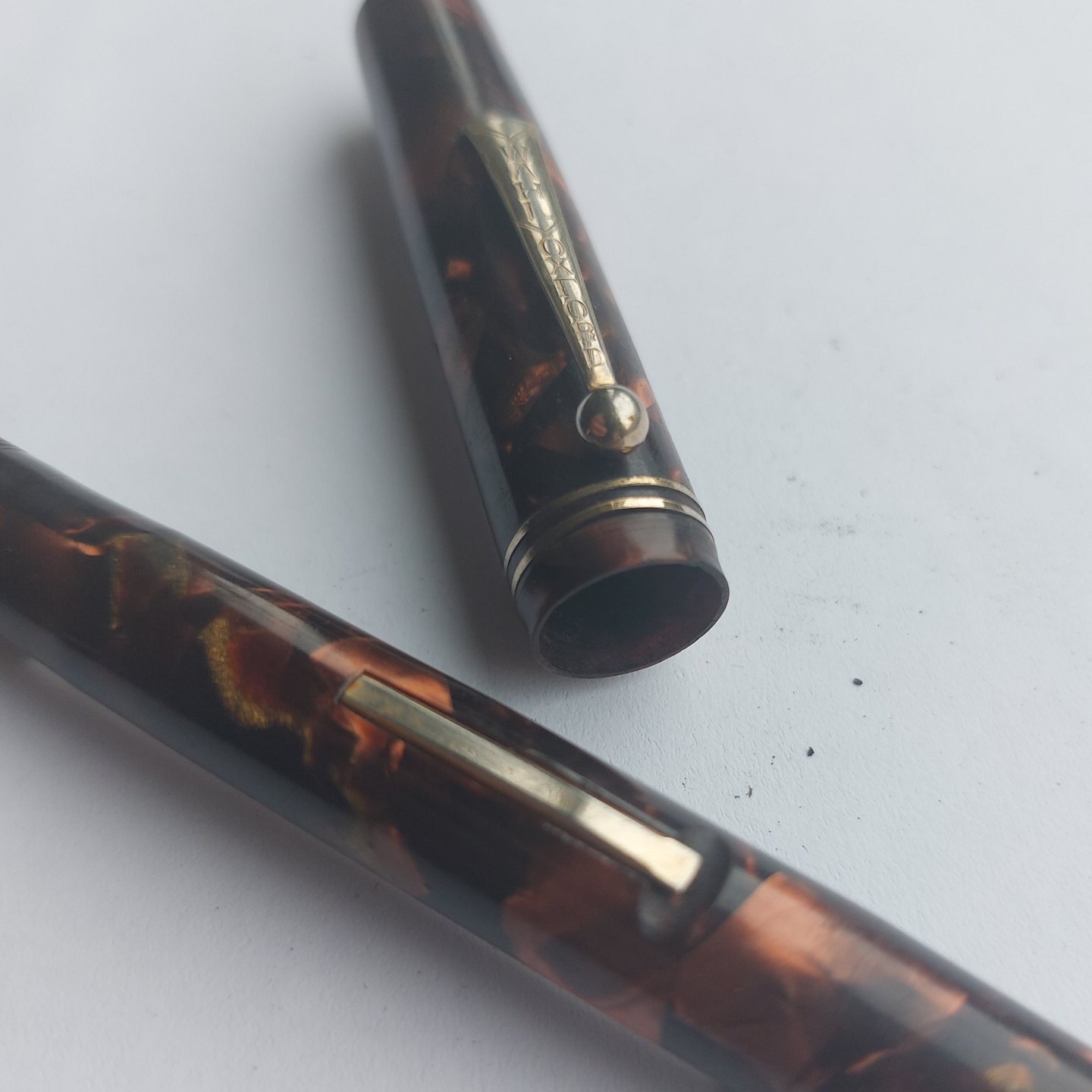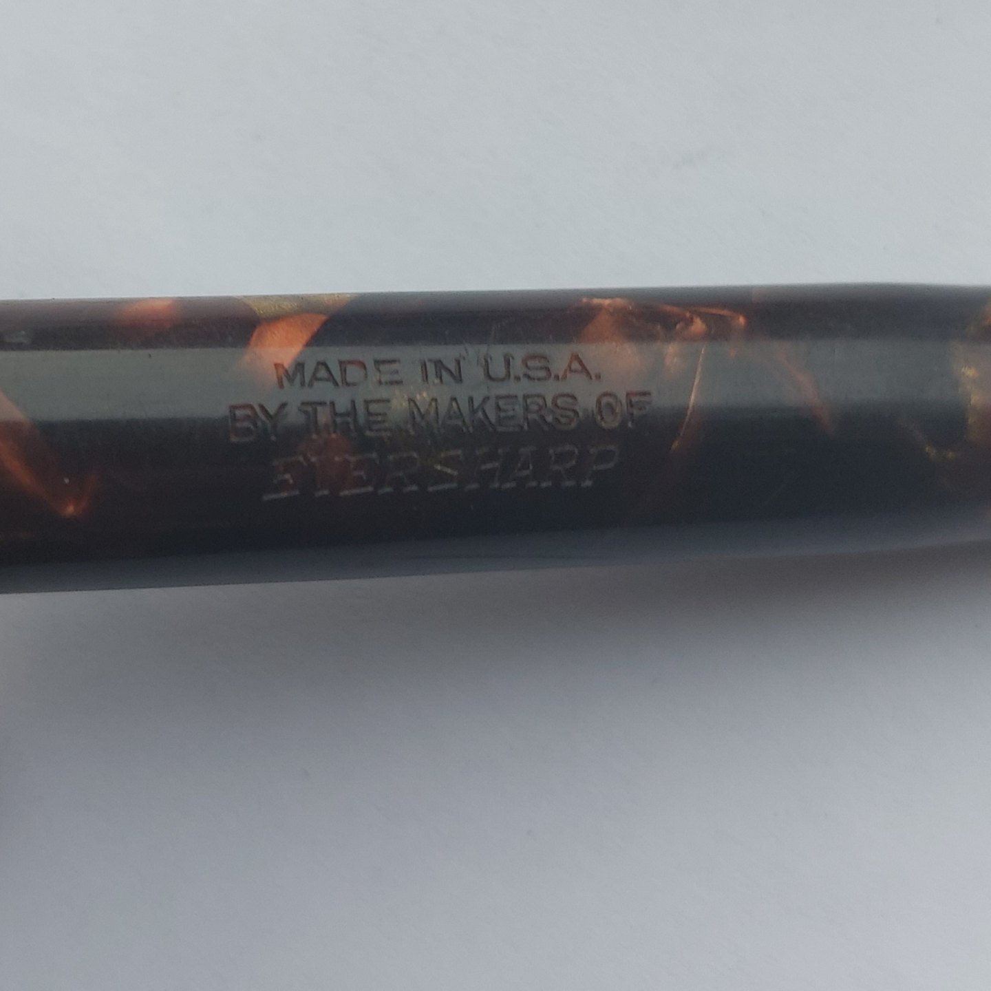 Eversharp produkt: Marmoreret Wahl Oxford fyldepen med leverfiller. Fremstår i god stand. Tekst på kroppen: Made in U.S.A by the maker of EVERSHARP. Ingen skader eller reparationer. 14 karat guldspids. Fungerer ikke. Der skal indsættes ny gummisæt før end fyldepennen skriver igen.