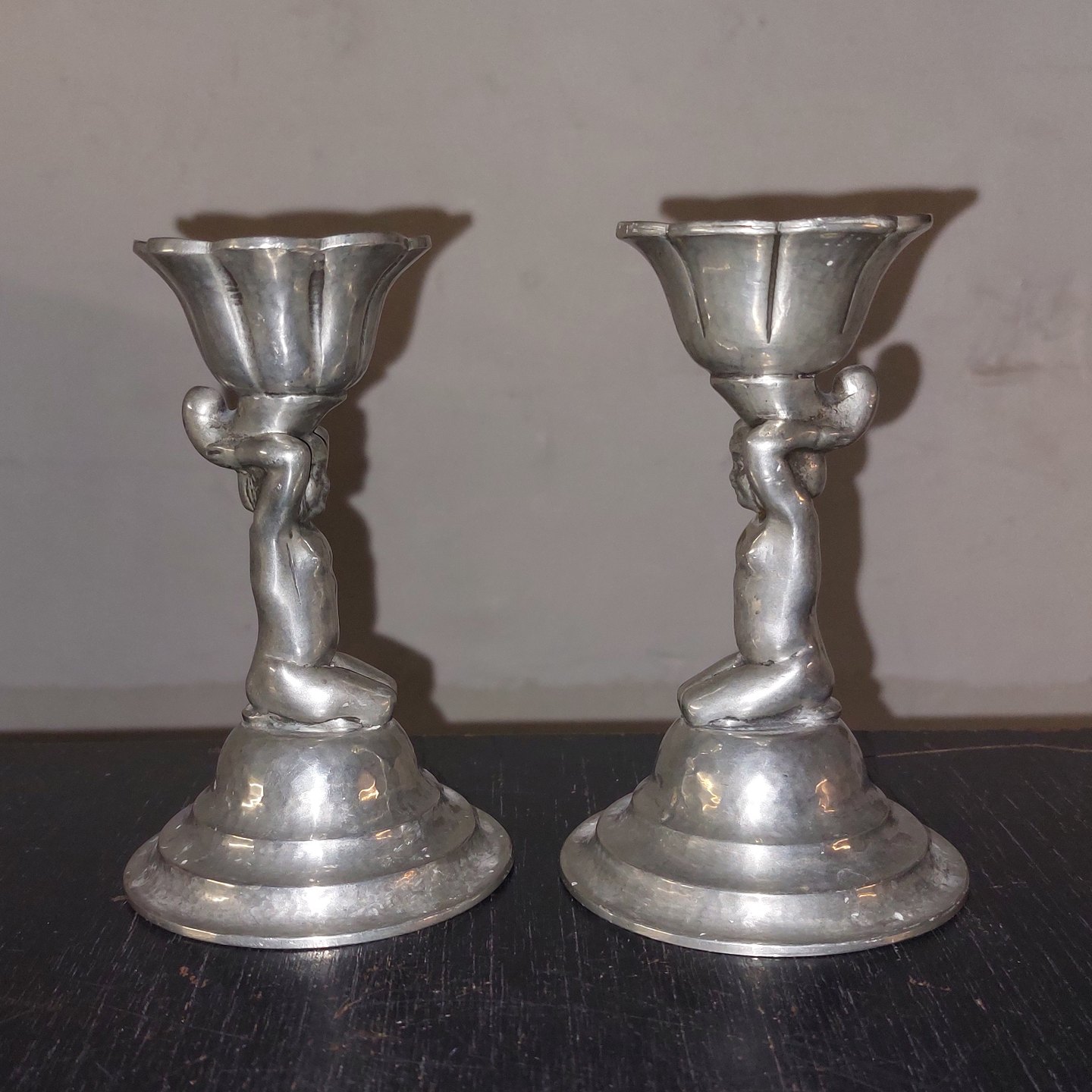 Par lysestager i tin. Ung nøgen kvinde holder lysthuset. Fremstår I god stand uden skader eller reparationer. Ubekendt fabriksmærke på undersiden. Fremstillet I art deco perioden omkring 1920. H. 13,5 cm