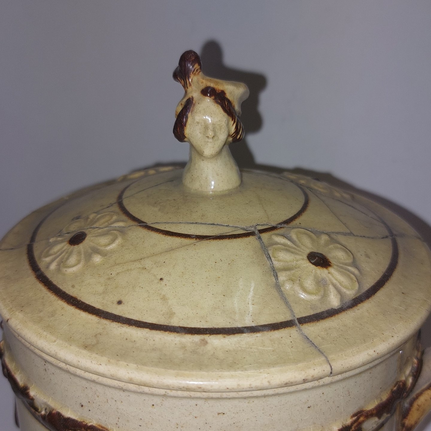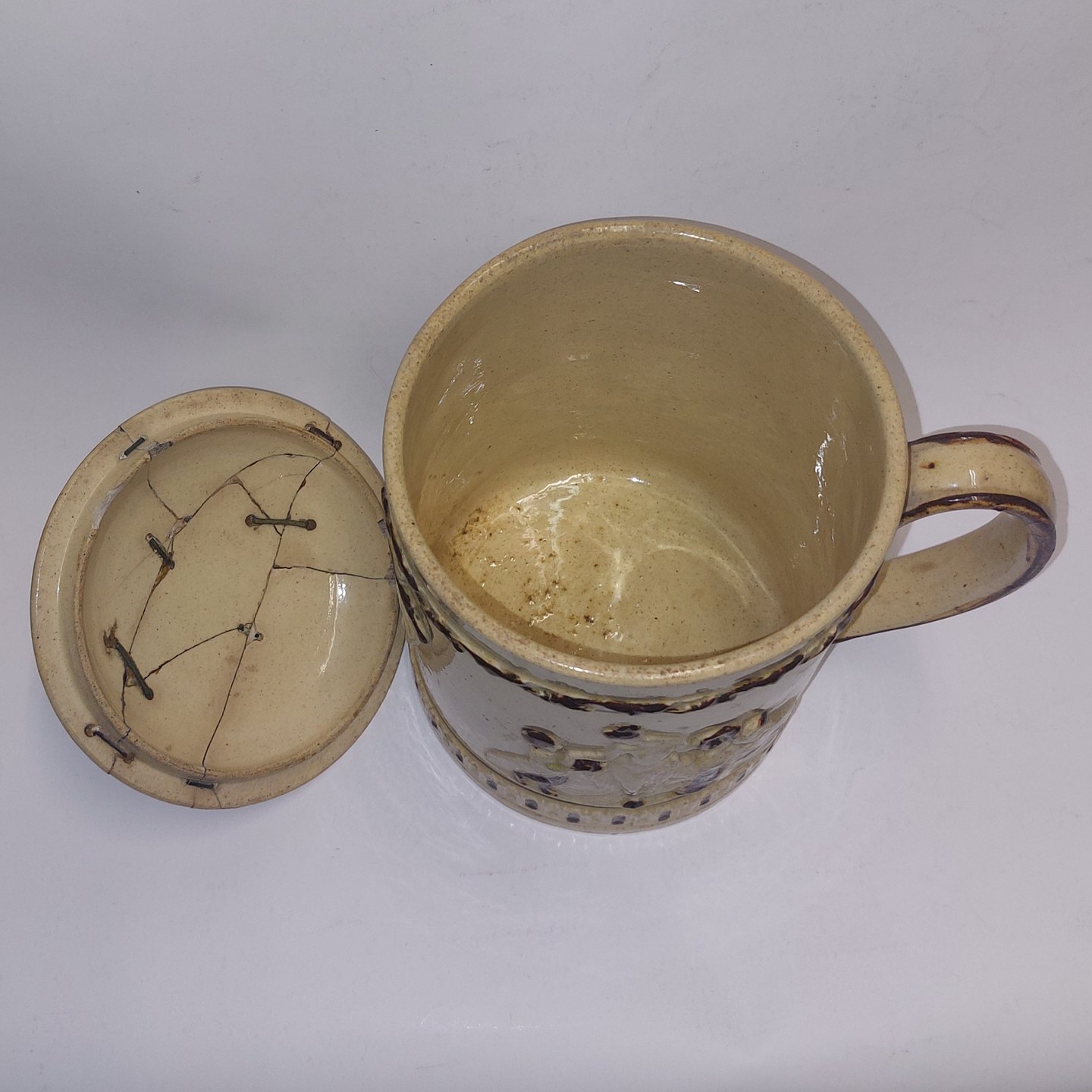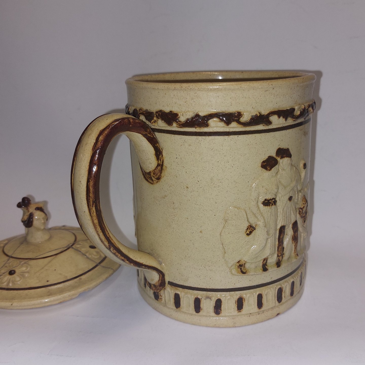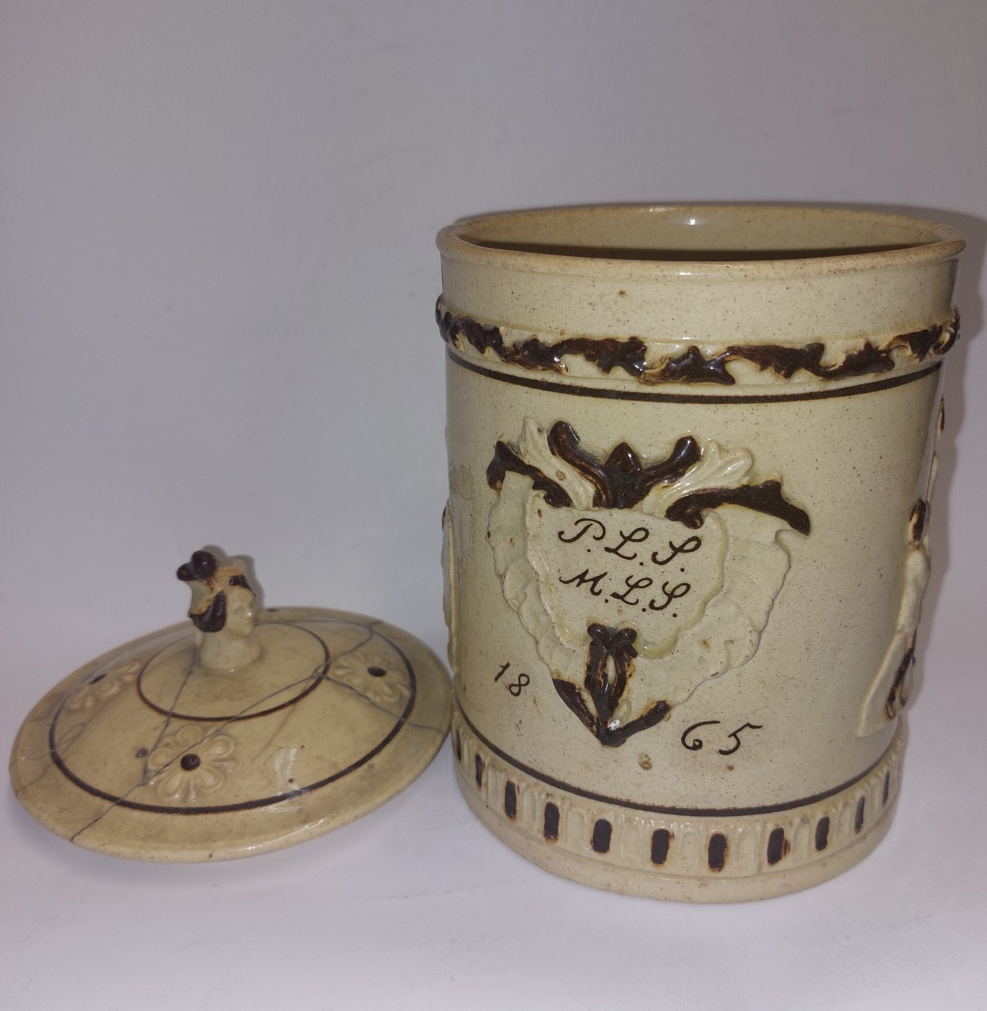 Stort Bryllups krus med låg fra Höganäs i Sverige. Låget klinket. Kruset i perfekt stand. Låget dekoreret med hoved. Kruset dekoreret med brudeparrets monogrammer samt med motiver i relief. To "Årstidet" af Bertel Thorvaldsen, samt årstallet 1865..H. 23,5 cm