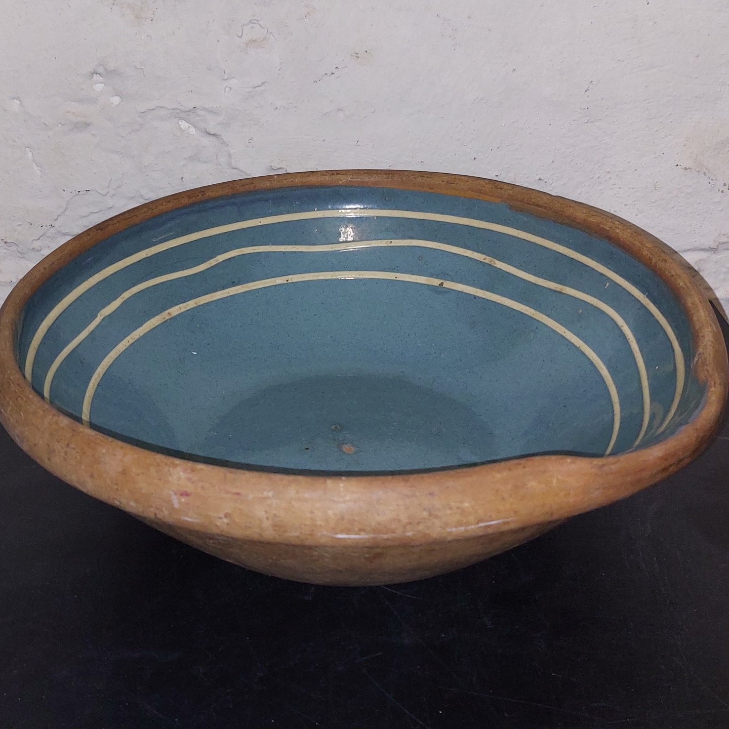 Gammel skål I lertøj. Blå glasur indvendigt med dekorativ lyse striber. Aldersrelateret brugsspor I bunden samt på kanten ved hældetuden. Formodes fremstillet omkring 1920. Mål: H. 11 cm Ø. 32 cm.