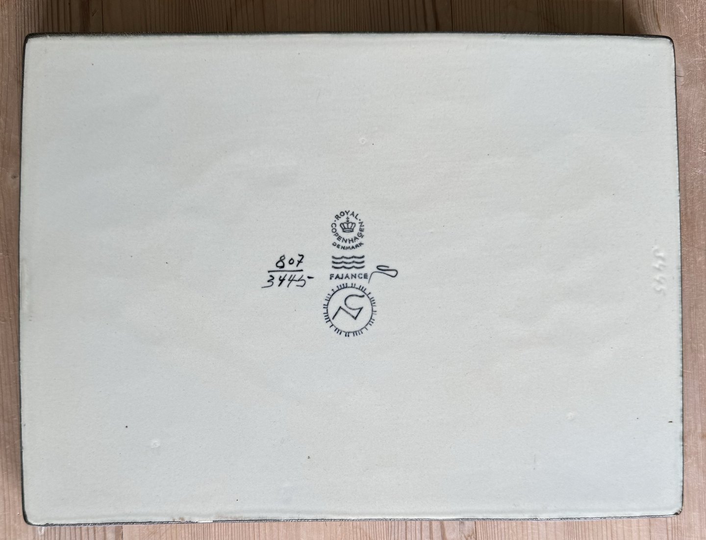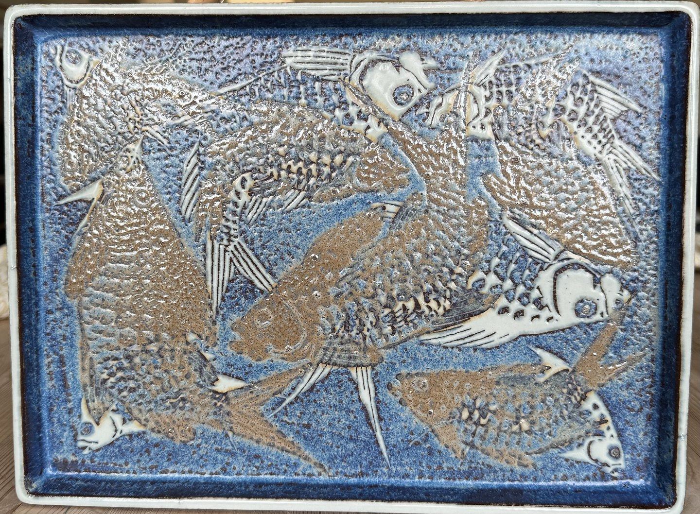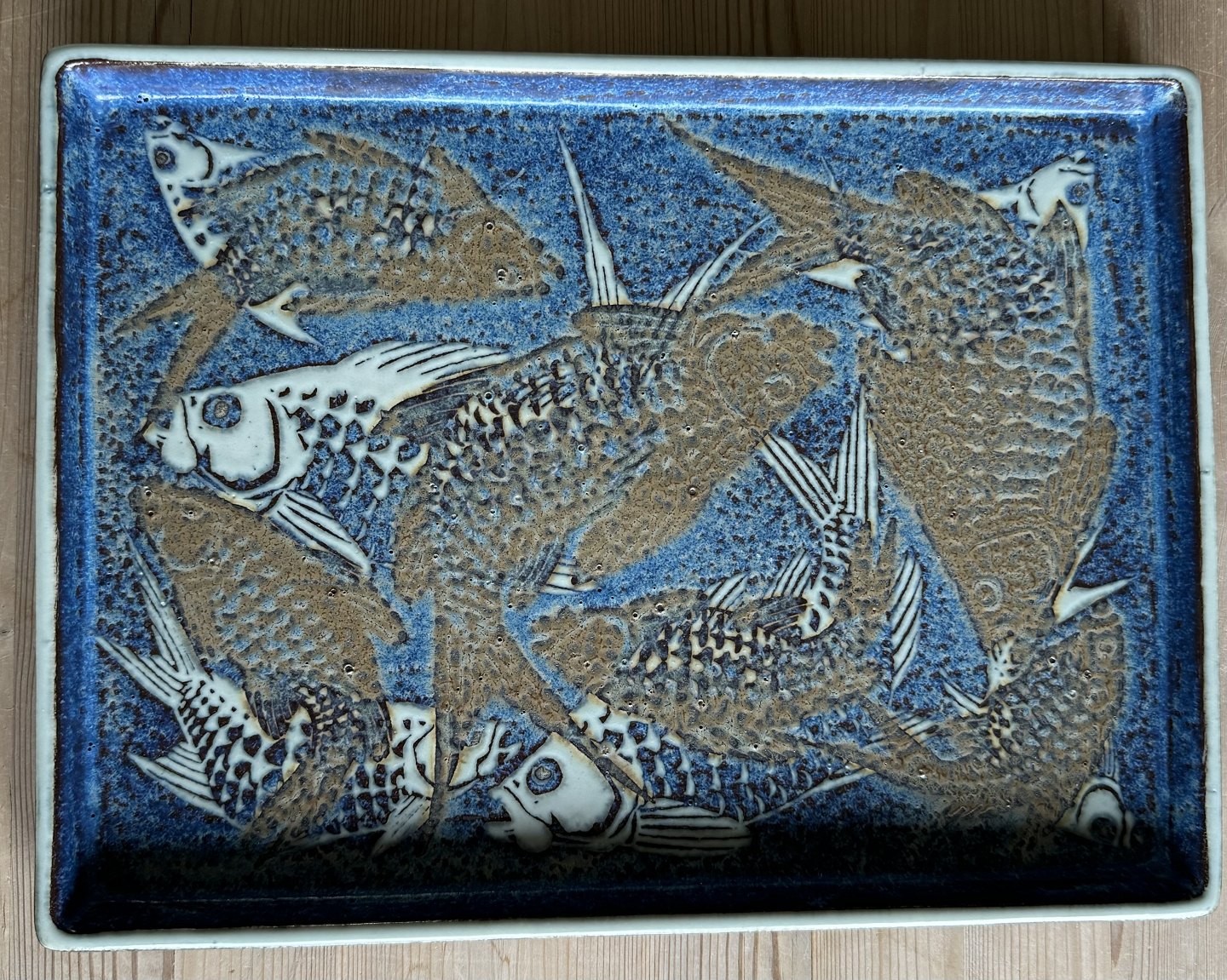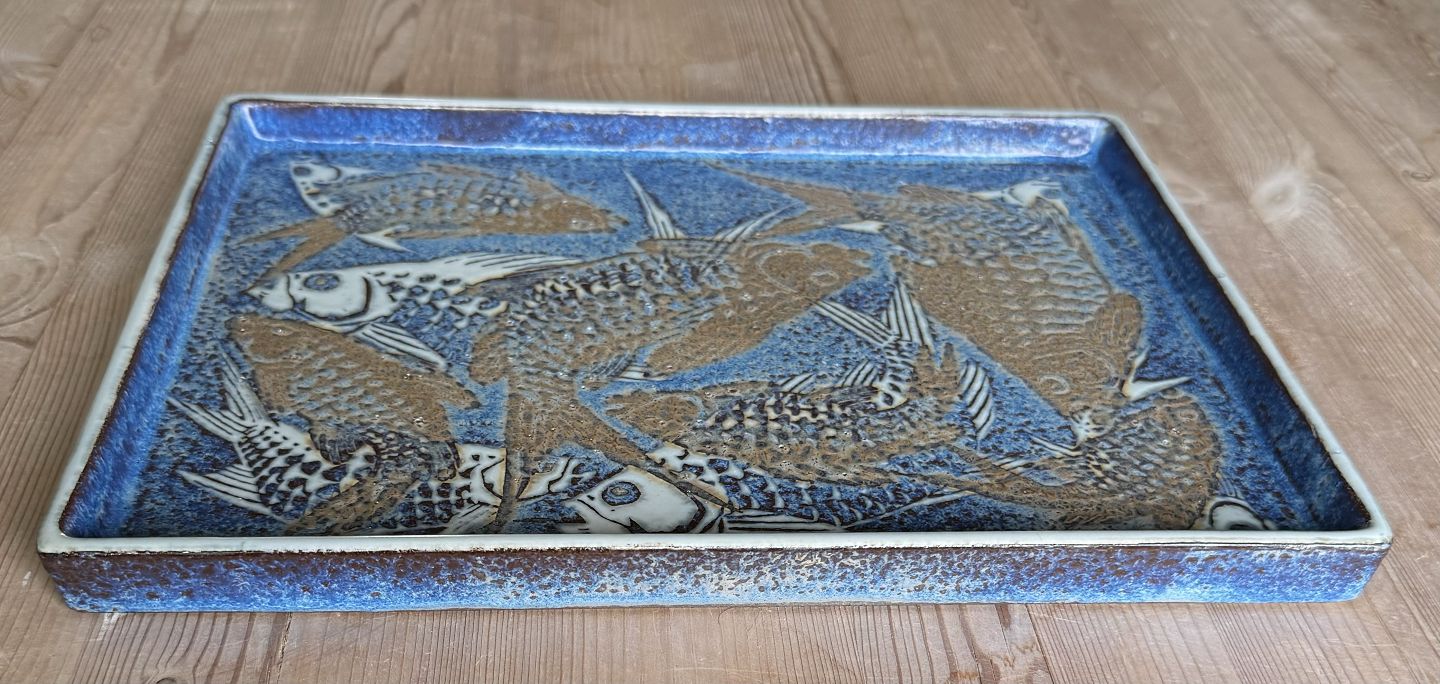 Square tray in Baca faience from Royal Copenhagen. Designed by Nils Thorsson. Fashion number 807 / 3445. Decorated with fish. Appears in good condition with no damage or repairs. Frist quality produktion. Dimensions: H. 2 cm and 22.5 x 30 cm