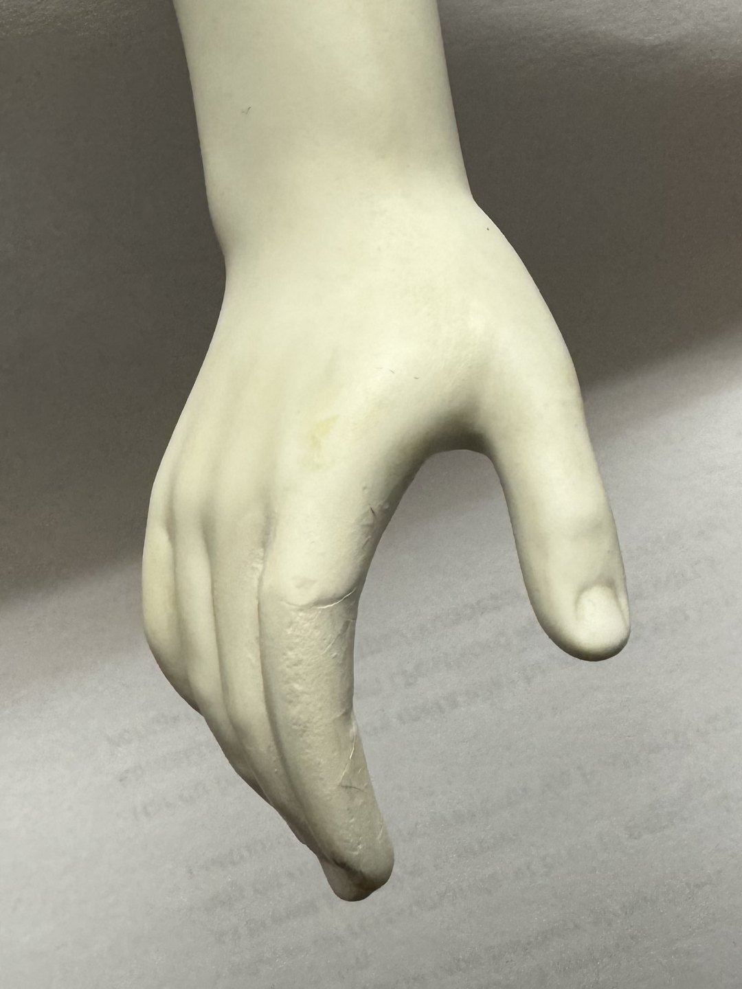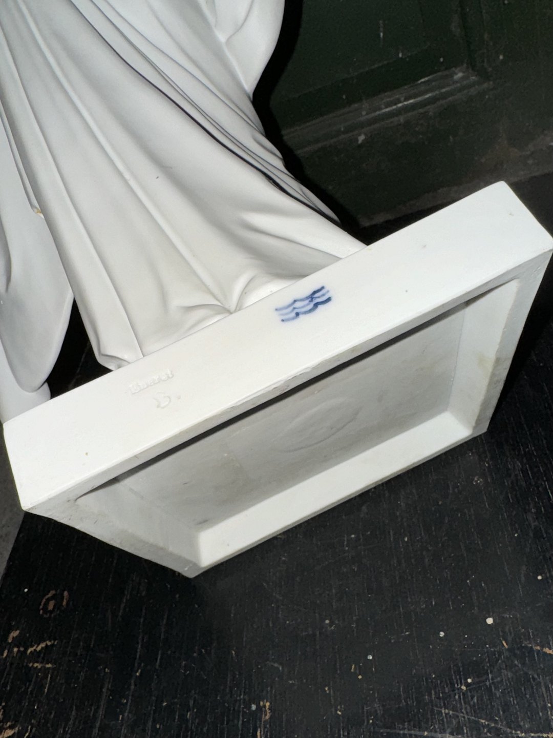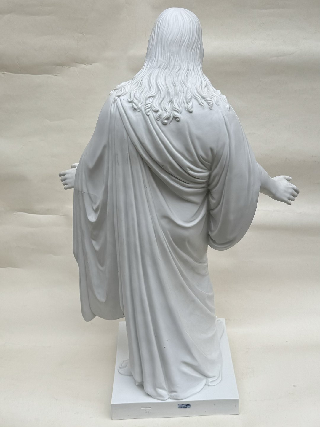 Største masseproducerede Jesus kristusfigur i bisquit porcelæn fra Royal Copenhagen fra omkring 1900. Der er passet godt på den, hvorfor der blot ses en mindre (gammel) reparation på højre pegefinger. Figur udført af Bertel Thorvaldsen (1770-1844). I god stand. Fabriksmærket på bagsiden af soklen. H. 49,5 cm