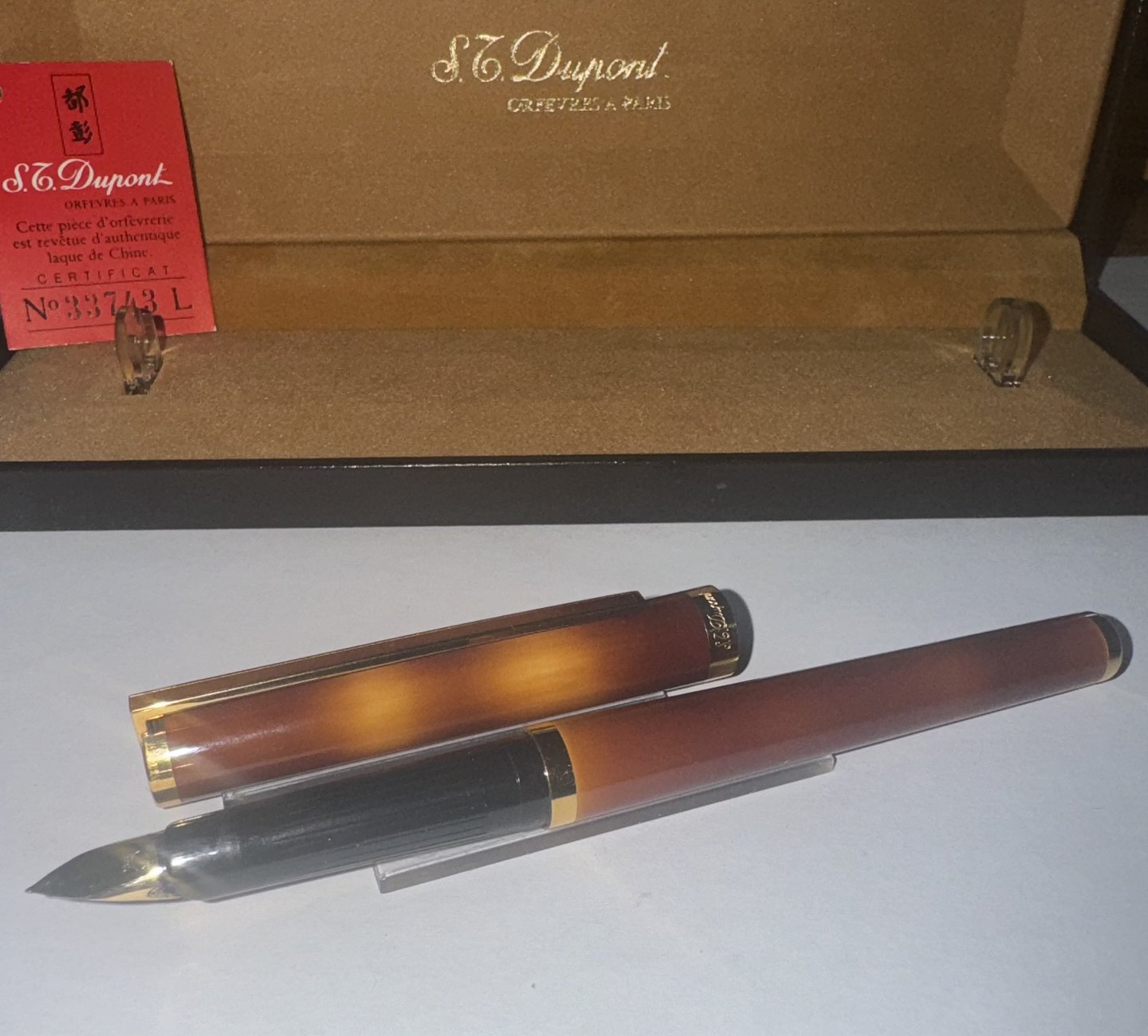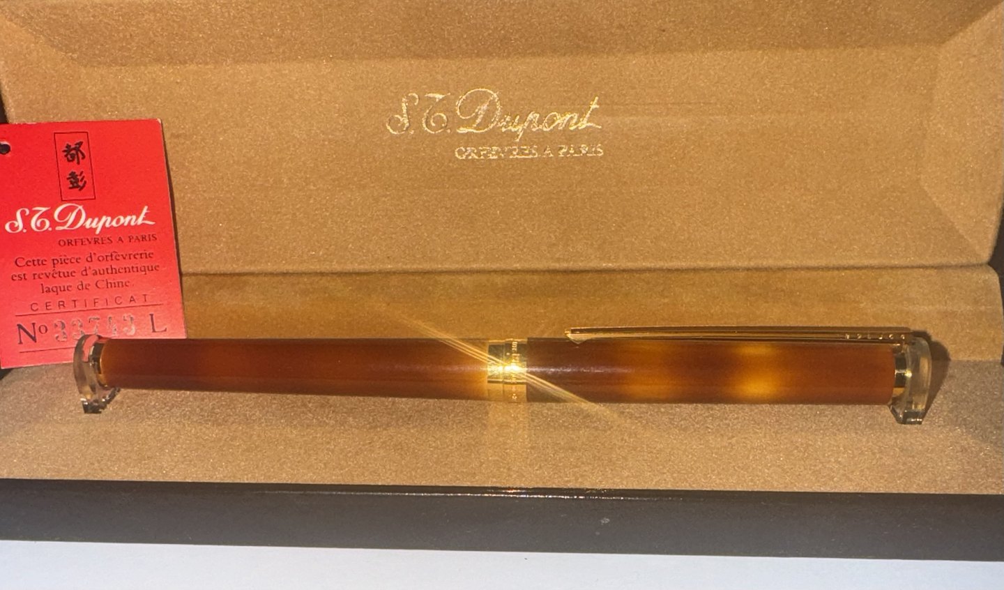 Vintage Sankt Dupont laque de Chine fyldepen med 18 karat 750 guldspids i original æske. I god stand. Klar til at blive brugt, når der bliver tilkøbt en ny blækpatron. Alle dele originale til denne model. Fyldepennen er 13,2 cm lang.