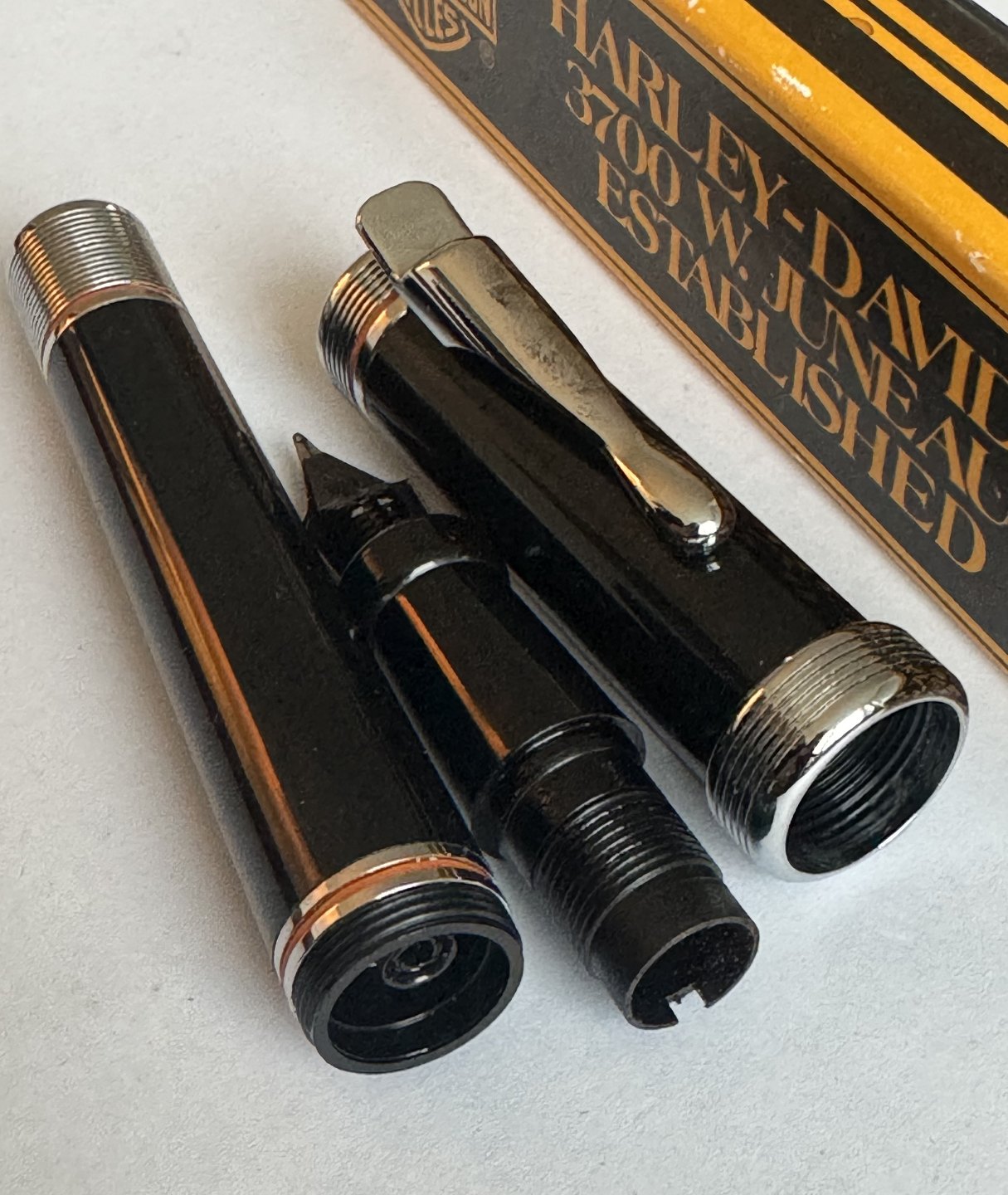Sort Harley Davidson fyldepen i original æske. Fremstår i god stand uden skader eller reparationer. Klar til at blive brugt, når der kommer en ny blækpatron i pennen. Alle dele originale til denne model inklusiv æsken. Fyldepennen er 12 cm lang.