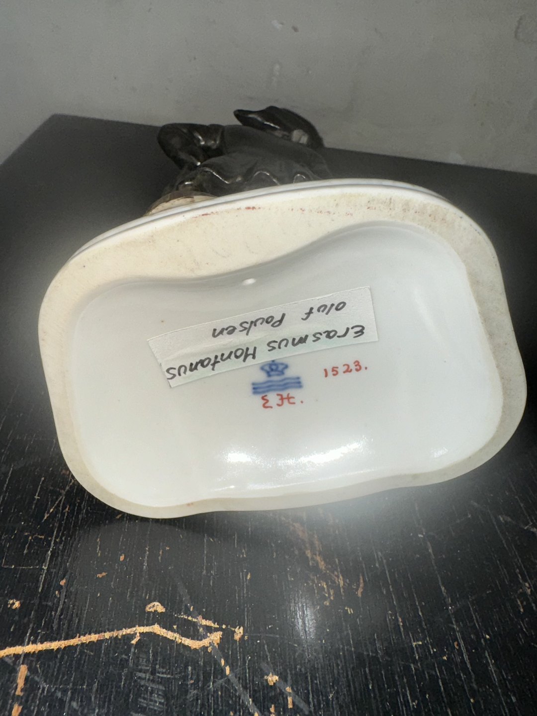 Erasmus Montanus - Porcelænsfigur Overglasur bemaling. Fremstillet hos Rpyal Copenhagen. Defekt (1) Finger på højre hånd .(2) Læder-strop samt lille skår på højre sko. Fabriksmærket på bunden med Juliane Marie mærke fra Royal Copenhagen samt modelnummer 1523. På forsiden af soklen indridset Erasmus Montanus. H. 23,5 cm