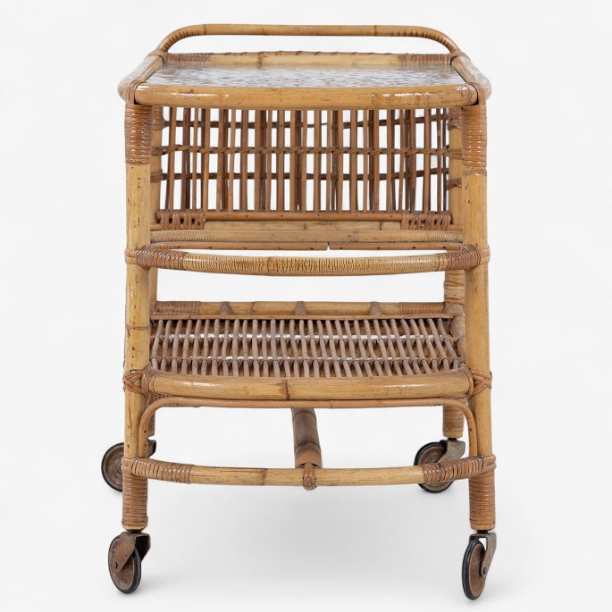 Rolling table in patinated bamboo with frosted glass top and wheels.