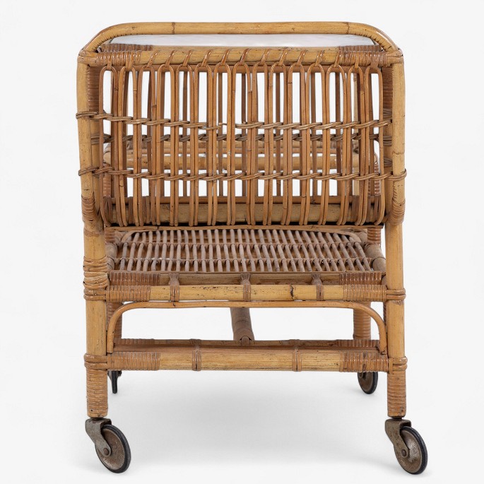 Rolling table in patinated bamboo with frosted glass top and wheels.