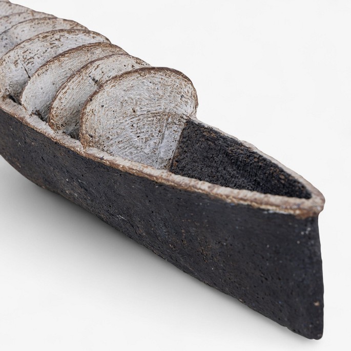 Boat-shaped sculpture in stoneware with brown-black and gray-white glaze. Unique.