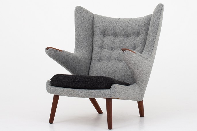 AP 19 - Nybetrukket Bamsestol i gråt Hallingdal 65-uld (kode 130) og sæde i uld (kode 180). Vi tilbyder polstring af Bamsestolen med stof eller læder efter eget ønske. Kontakt os venligst for mere information.