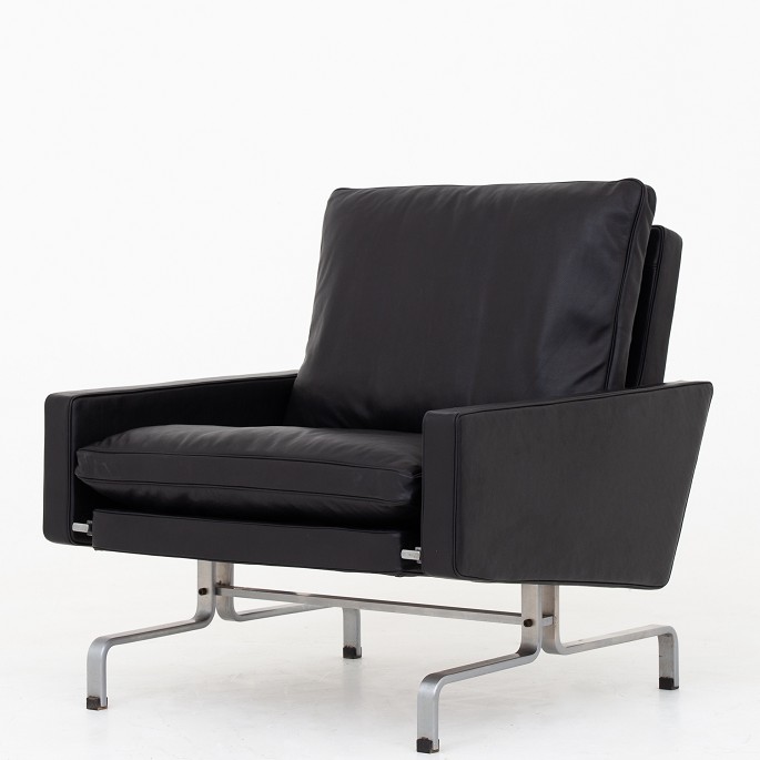 PK 31/1 - Nybetrukket lænestol i Shade-læder (Pitch Black) på stel af stål. KLASSIK tilbyder polstring af lænestolen med stof eller læder efter eget valg.