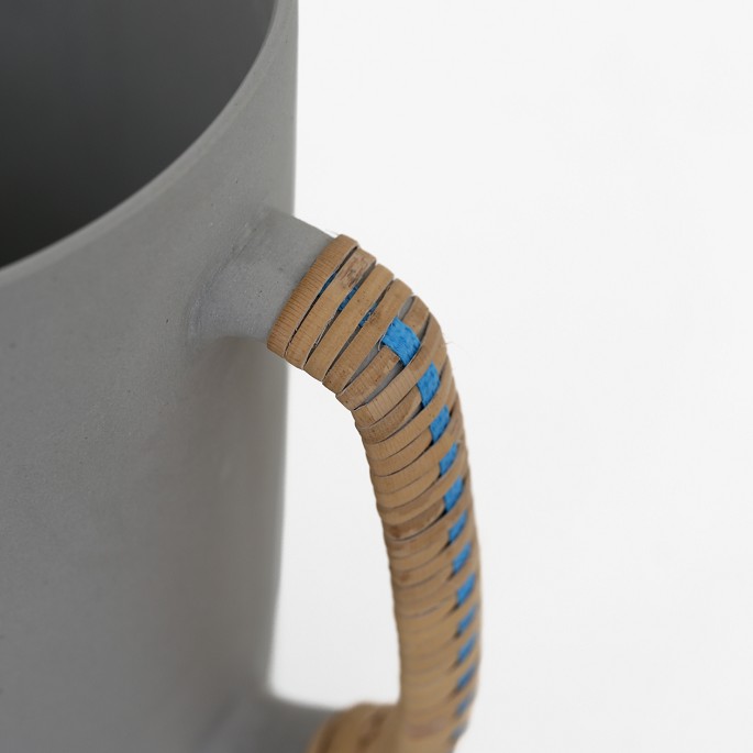 Håndlavet kande i stentøj med grå glasur og flettet hank med blå stribe. Serien 'VAND'.