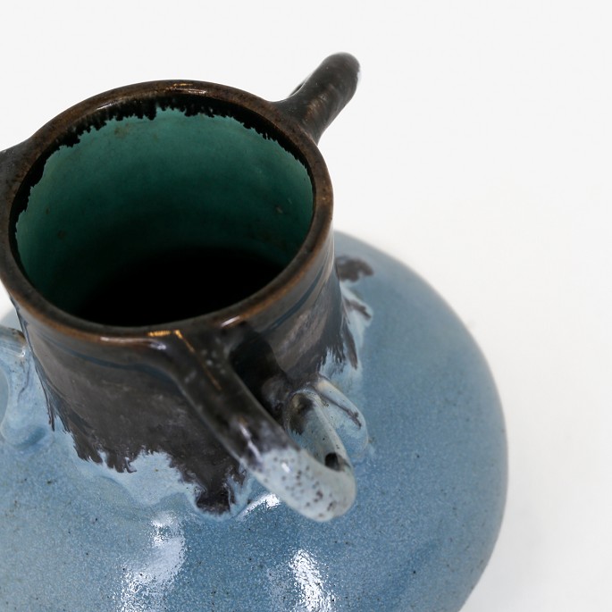 Vase i stentøj med hhv. blå og sort glasur fra start 1900-tallet.
