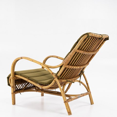 Kurvestol i flettet bambus med ny hynde i Toile Mistral (farve Militaire) fra Pierre Frey.
