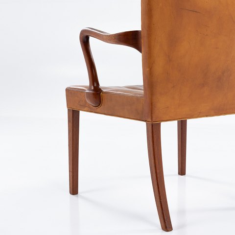 Armstol i massiv teak og originalt, patineret naturlæder.
