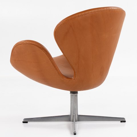 AJ 3220 - Reupholstered 'The Swan' lounge chair in Klassik Cognac aniline leather with a solid aluminium base.