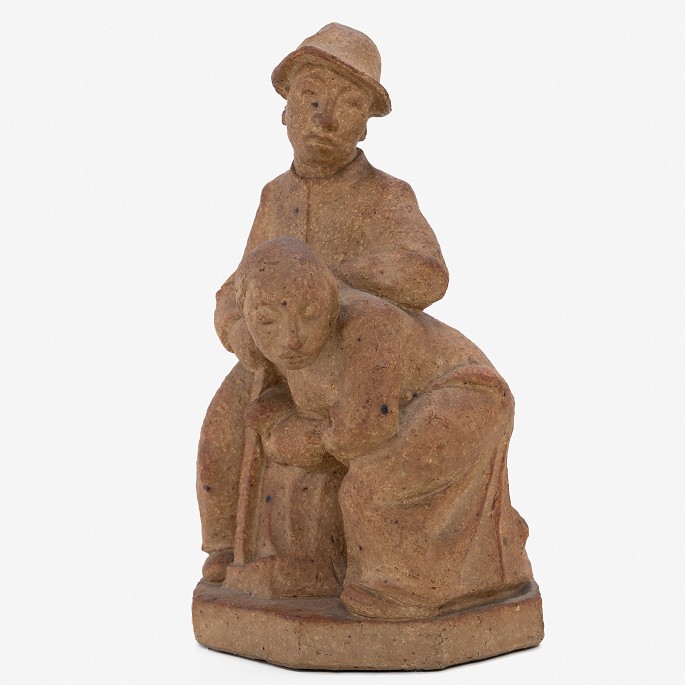 Sculpture of man and wife in unglazed stoneware.
