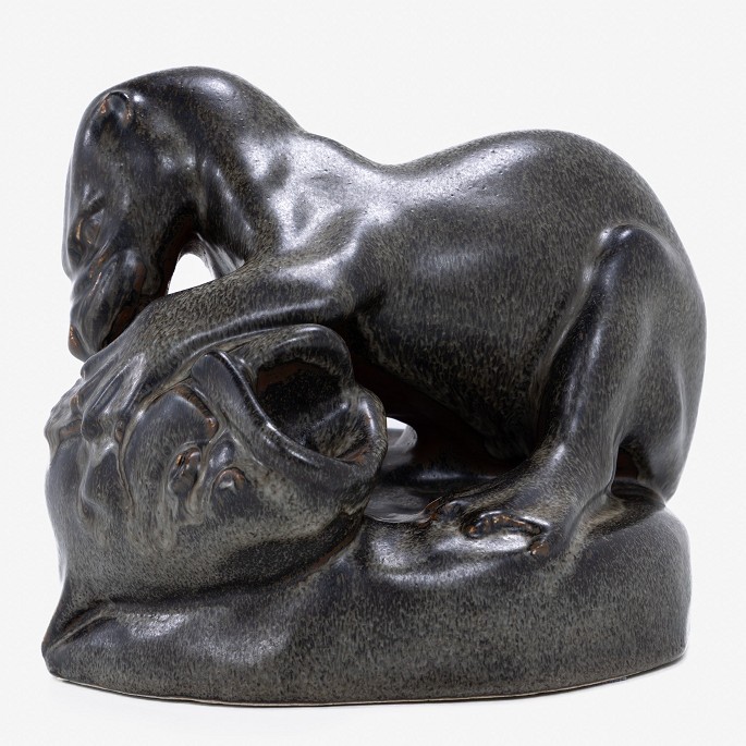 Sculpture of otter and fish in stoneware. Stamped.