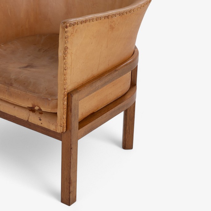 MK 51 - 'Kaminstol' i mahogni og patineret naturlæder. Formgivet i 1936. Mærket fra producent.