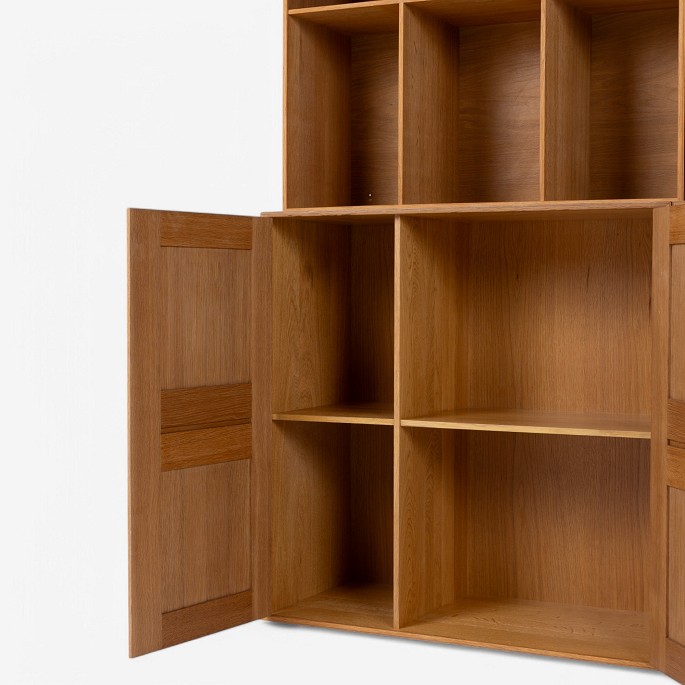Sæt på tre skabe og seks bogkasser i patineret massiv eg.