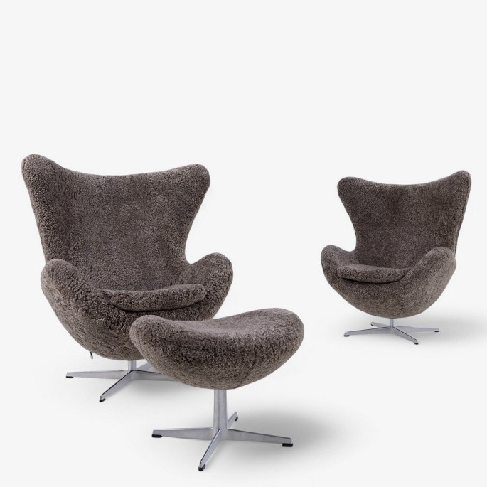 AJ 3316 - Newly upholstered 'Egg' armchair in lambskin (Sahara 07, Curly 17mm) with solid cast aluminium base.