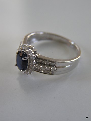 Ring i Rhodineret guld 9kt. med Safir samt 45 mindre Diamanter 0,56ct. 17,25mm. Emne nummer: 10990