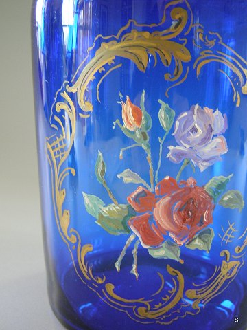 Flot koboltblå Flaske/Karaffel med bemaling og forgyldt træprop H: 27,5 cm med prop 32 cm. Emne nummer: 11581
