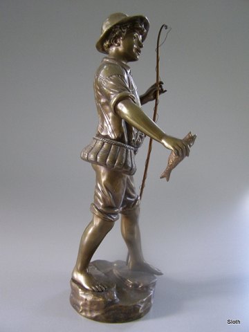 Dreng i Bronze med Fisk og Fiskestang sign G. Omerth (Georges Omerth 1895-1925 Frankrig) H: 39,5 cm.