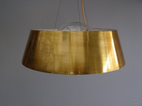 A.J. Pendel af messing, med wireophæng, hvidlakeret indvendig og midterdel med klar glaskuppel pæreformet H: 24 cm. D: 48 cm. Emne nummer: 12015