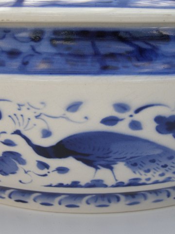 Københavns Fajancefabrik, Påfugl stel, Oval skål med låg, h:11cm. l: 21,5cm.