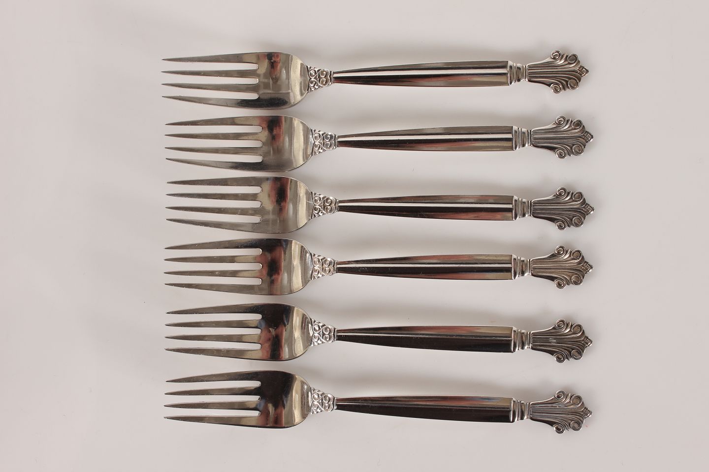 Georg Jensen Sølvsmedie Dronning bestik af sterling sølv tegnet af Johan Rohde i 1917 Middagsgafler Længde 18,2 cm Med stempel fra perioden efter 1945 og i perioden 1930-45 Fin stand