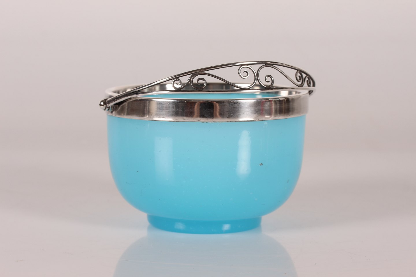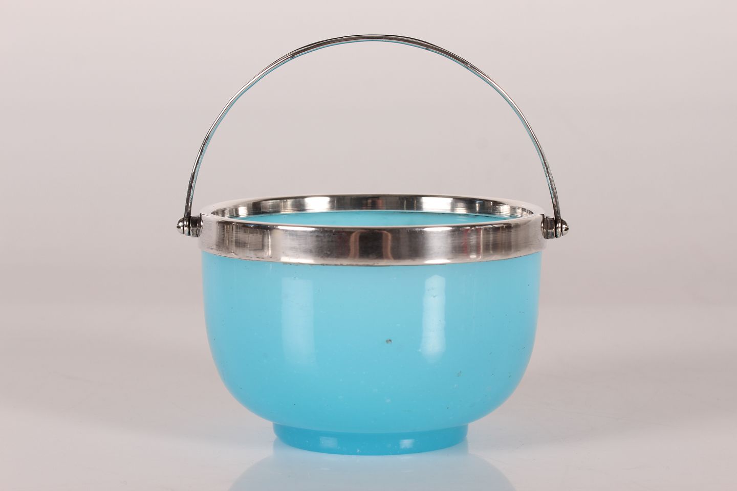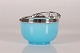 Gl. sukkerkumme eller kandiskål Fremstillet af lyseblåt glas med hank af forsølvet messing Højde incl. hank 13,5 cm Diameter 11,5 cm Fin fejlfri stand