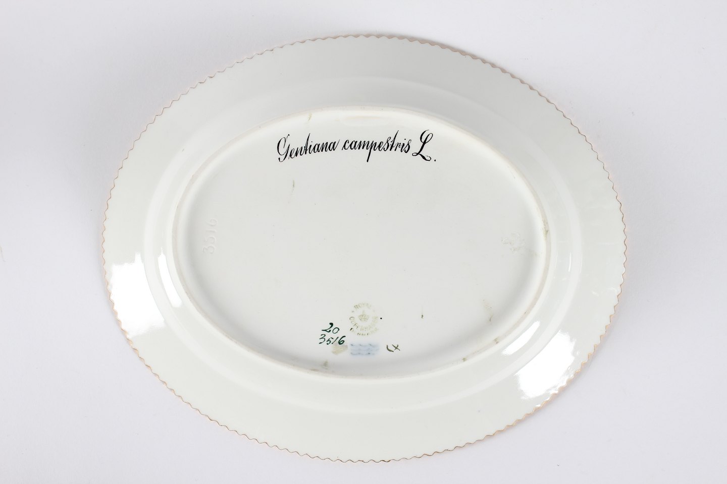 Royal Copenhagen Flora Danica Minor oblong serving Dish model 3516 with flower decoration"Gentiana Campestris L" With Stamp from 1949 Length 25 cm Width 20 cm Mint condition 1. quality