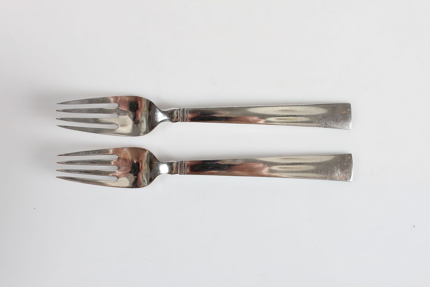 Georg Jensen (1866-1935) Blok sølvbestik af sterling sølv 925s Tegnet af Just Andersen i 1934 Middagsgafler Længde 18 cm Fin stand uden gravering
